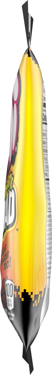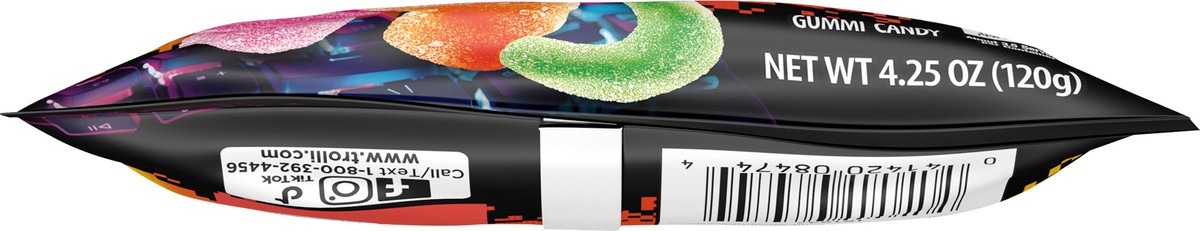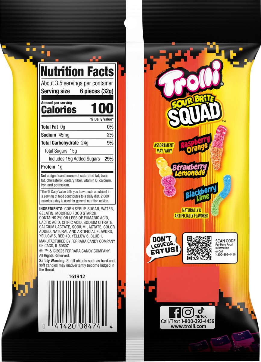 Naturally & artificially flavored. 100 calories per serving. About 3.5 servings per container. New! Devour the sour trio! Assortment may vary. Don't leave us, eat us! www.trolli.com. Scan code for mor…