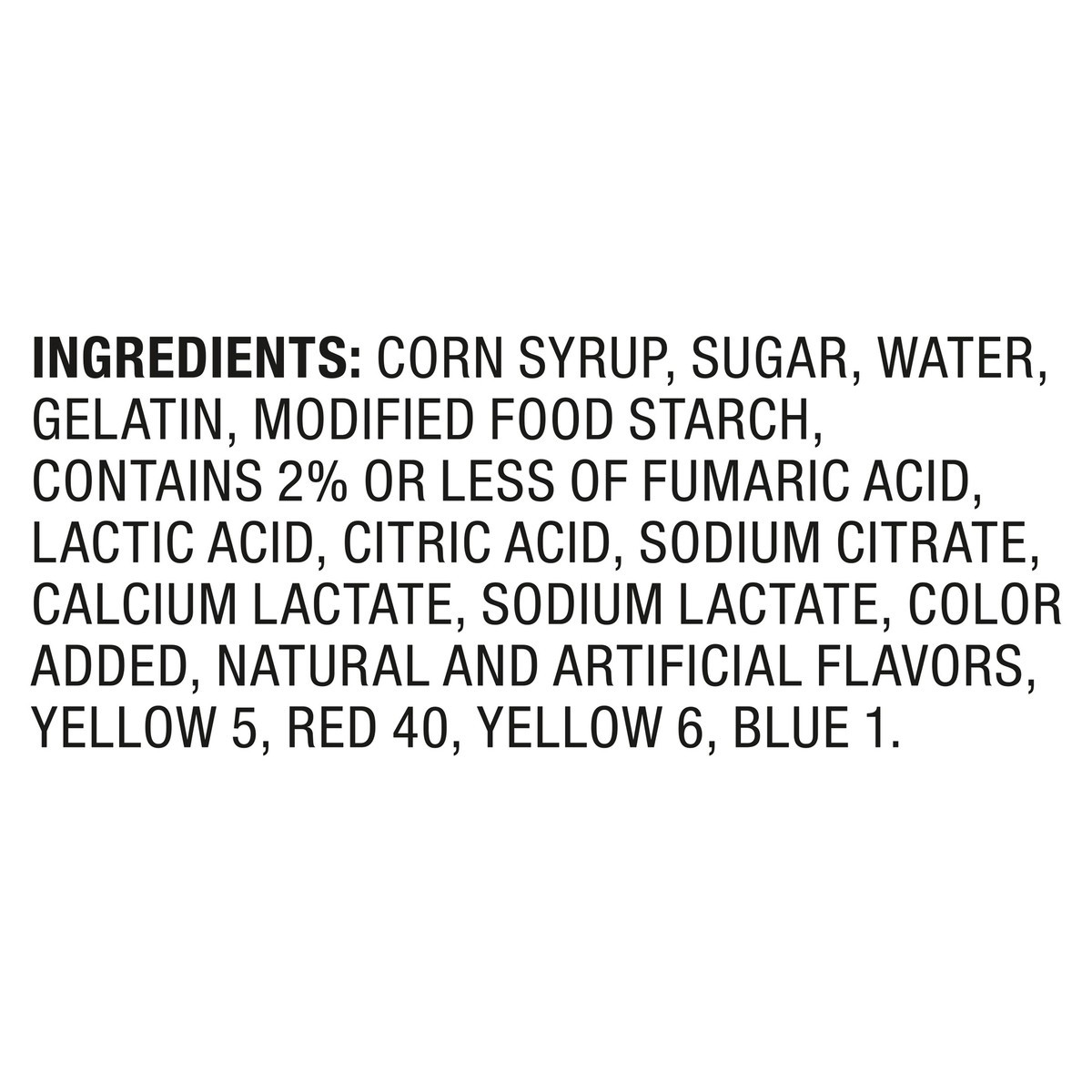 Corn Syrup, Sugar, Water, Gelatin, Modified Food Starch, Contains 2% or Less of Fumaric Acid, Lactic Acid, Citric Acid, Sodium Citrate, Calcium Lactate, Sodium Lactate, Color Added, Natural and Artifi…