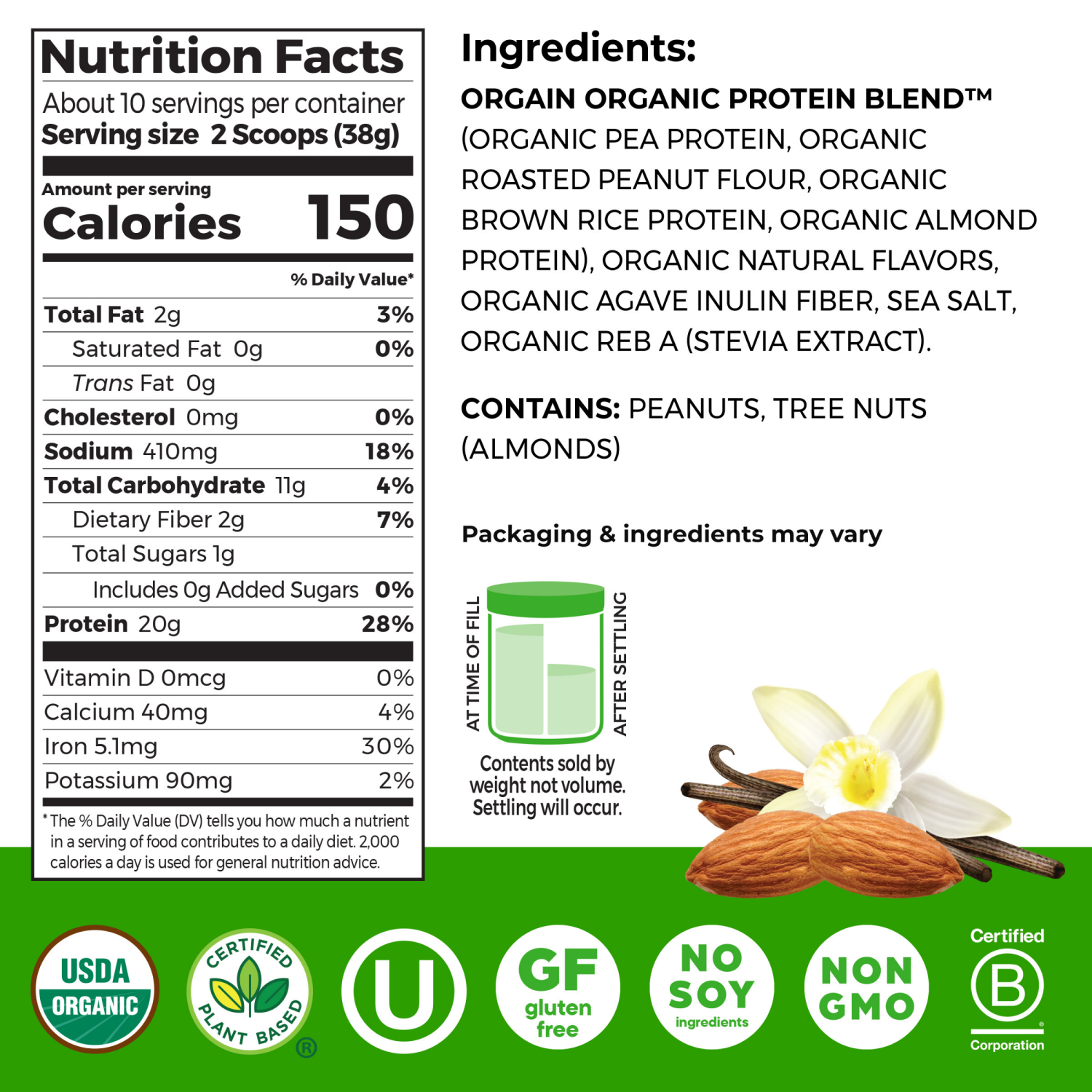 Orgain Organic Protein Blend™ (Organic Pea Protein, Organic Roasted Peanut Flour, Organic Brown Rice Protein, Organic Almond Protein), Organic Natural Flavors, Organic Alkalized Cocoa, Organic Agave I…