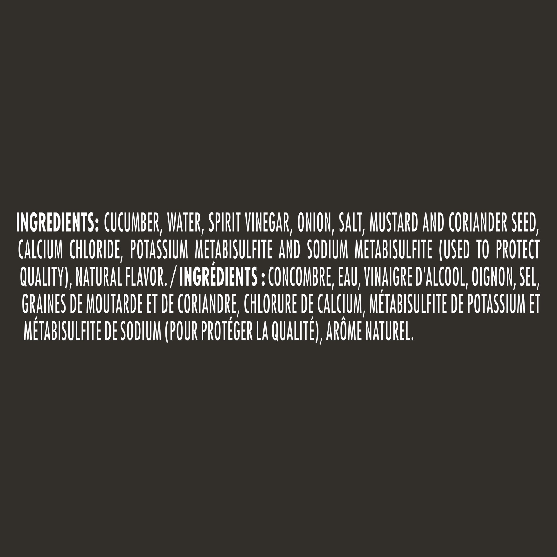 Cucumber, Water, Spirit Vinegar, Onion, Salt, Mustard and Coriander Seed, Calcium Chloride, Potassium Metabisulfite and Sodium Metabisulfite (Used to Protect Quality), Natural Flavor.