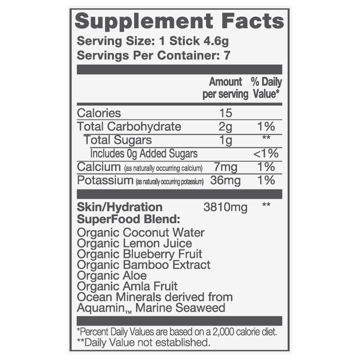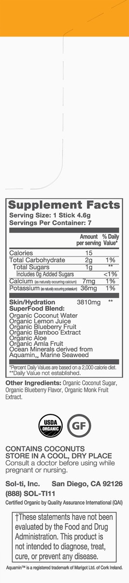 Skin/Hydration Superfood Blend: Organic Coconut Water, Organic Lemon Juice, Organic Blueberry Fruit, Organic Bamboo Extract, Organic Aloe, Organic Amla Fruit, Ocean Minerals Derived from Aquamin Marin…
