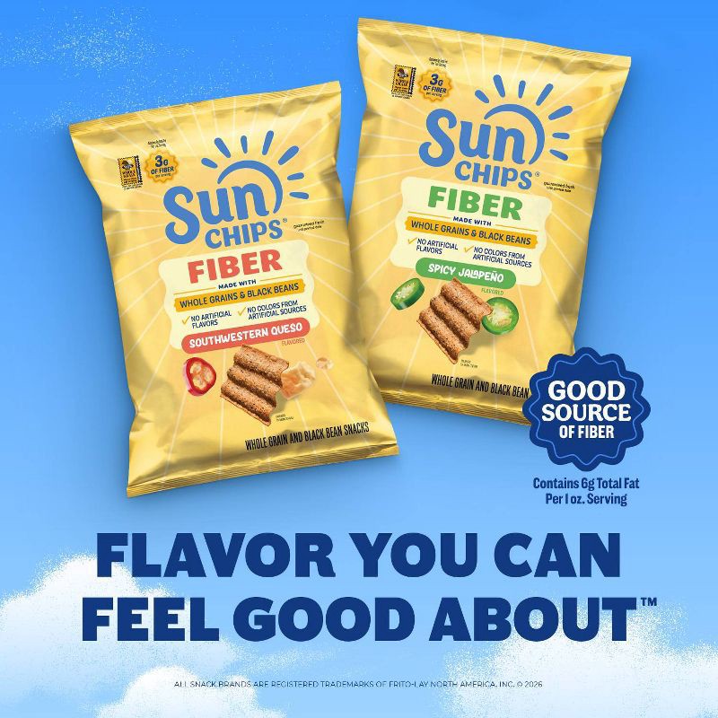 - Good Source of Fiber: SunChips Fiber Snacks contain 3g of fiber per serving (contains 6g total fat per 1oz serving).