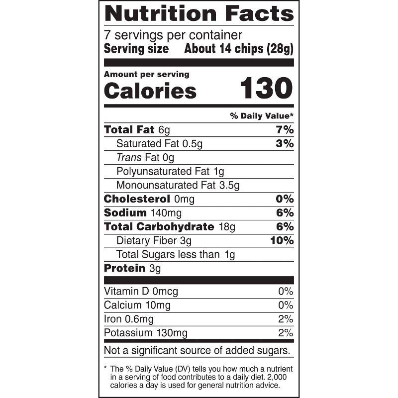 - 30% less fat than regular potato chips: regular potato chips contain 10g of fat per 1 oz serving. SunChips Fiber Whole Grain and Black Bean Snacks contain 6g of fat per 1 oz serving.