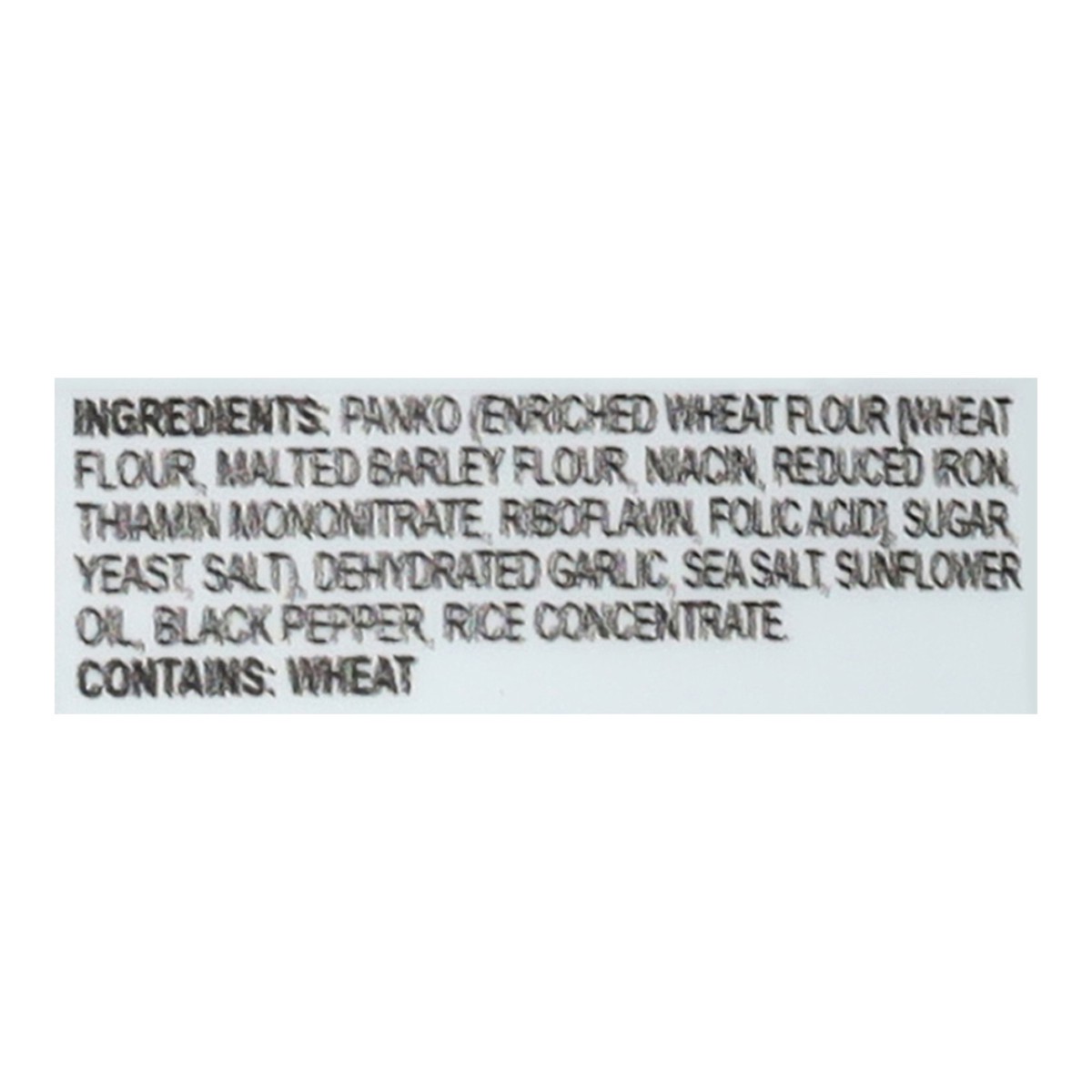 Panko (Enriched Wheat Flour Wheat Flour, Malted Barley Flour, Niacin, Reduced Iron, Thiamin Mononitrate, Riboflavin, Folic Acid), Sugar Yeast, Salt, Dehydrated Garlic, Sea Salt, Sunflower Oil, Black P…
