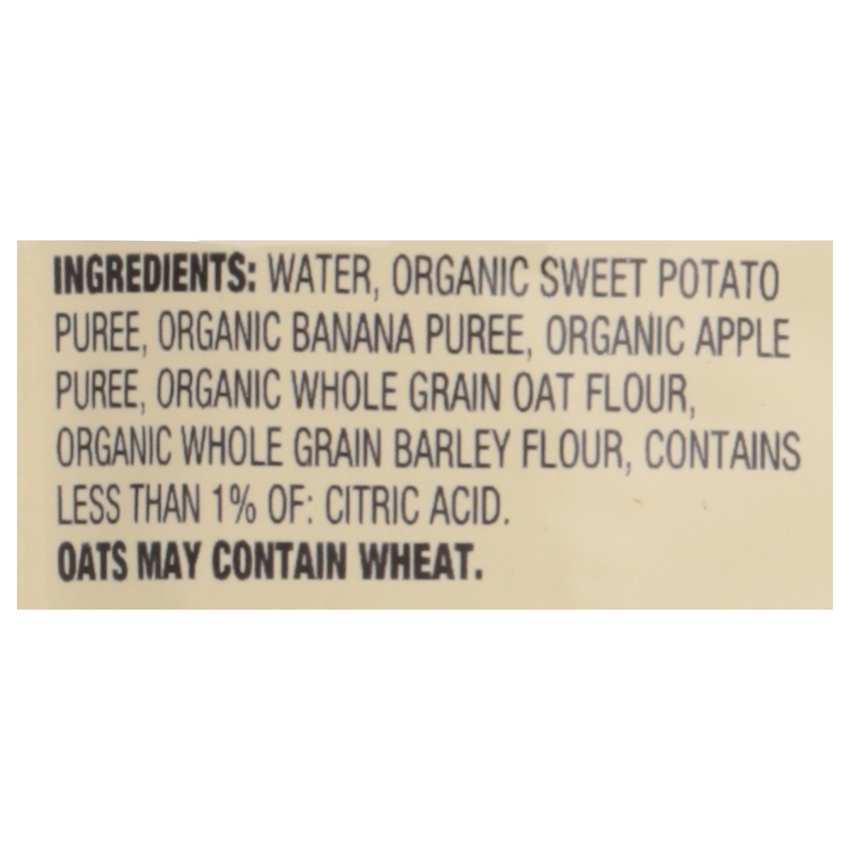 Water, Organic Sweet Potato Puree, Organic Banana Puree, Organic Apple Puree, Organic Whole Grain Oat Flour, Organic Whole Grain Barley Flour, Contains Less than 1% of: Citric Acid.