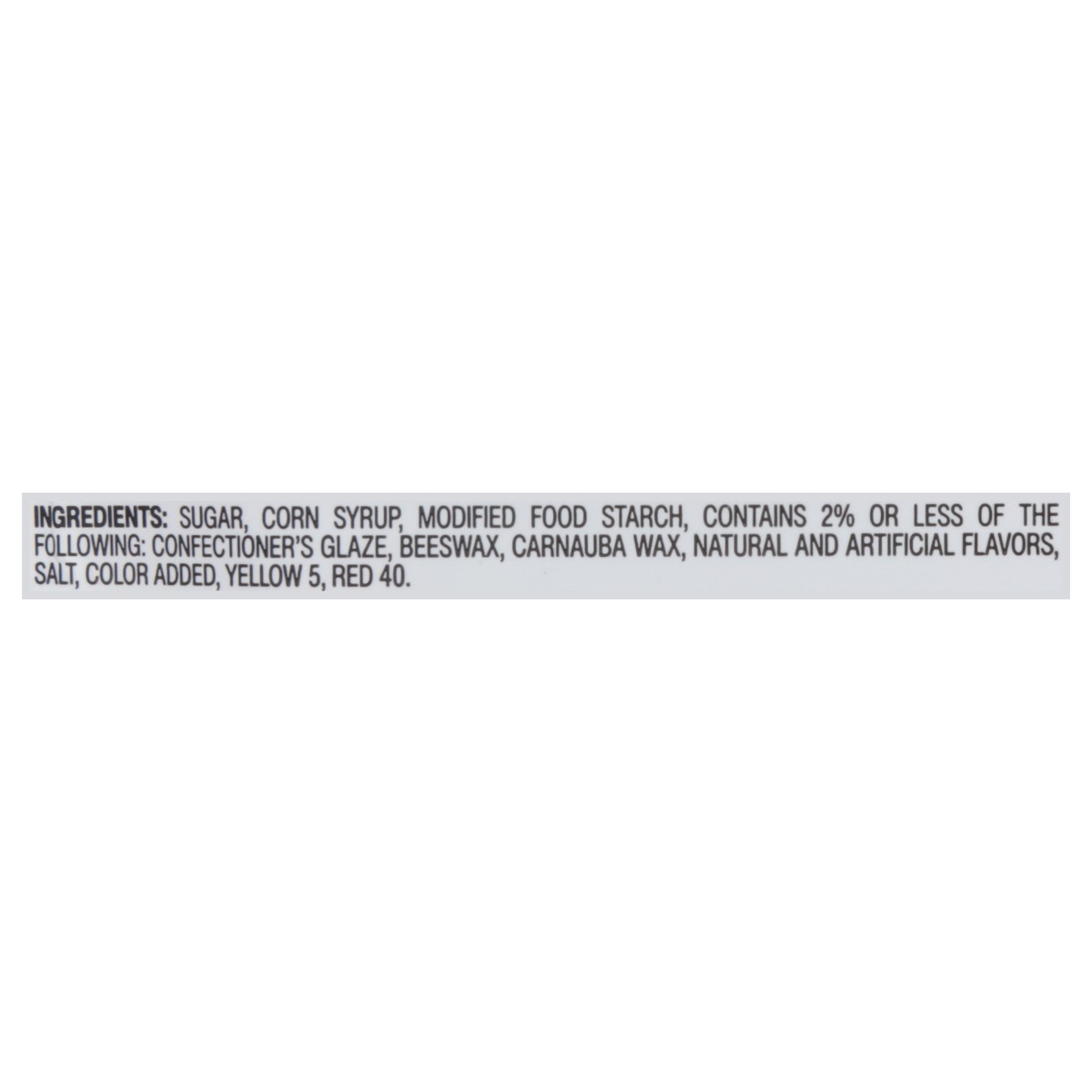 Sugar, Corn Syrup, Modified Food Starch, Contains 2% or Less of the Following: Confectioner's Glaze, Beeswax, Carnauba Wax, Natural and Artificial Flavors, Salt, Color Added, Yellow 5, Red 40.