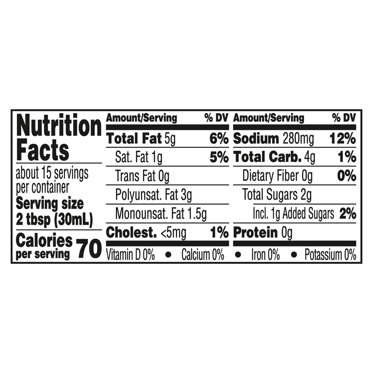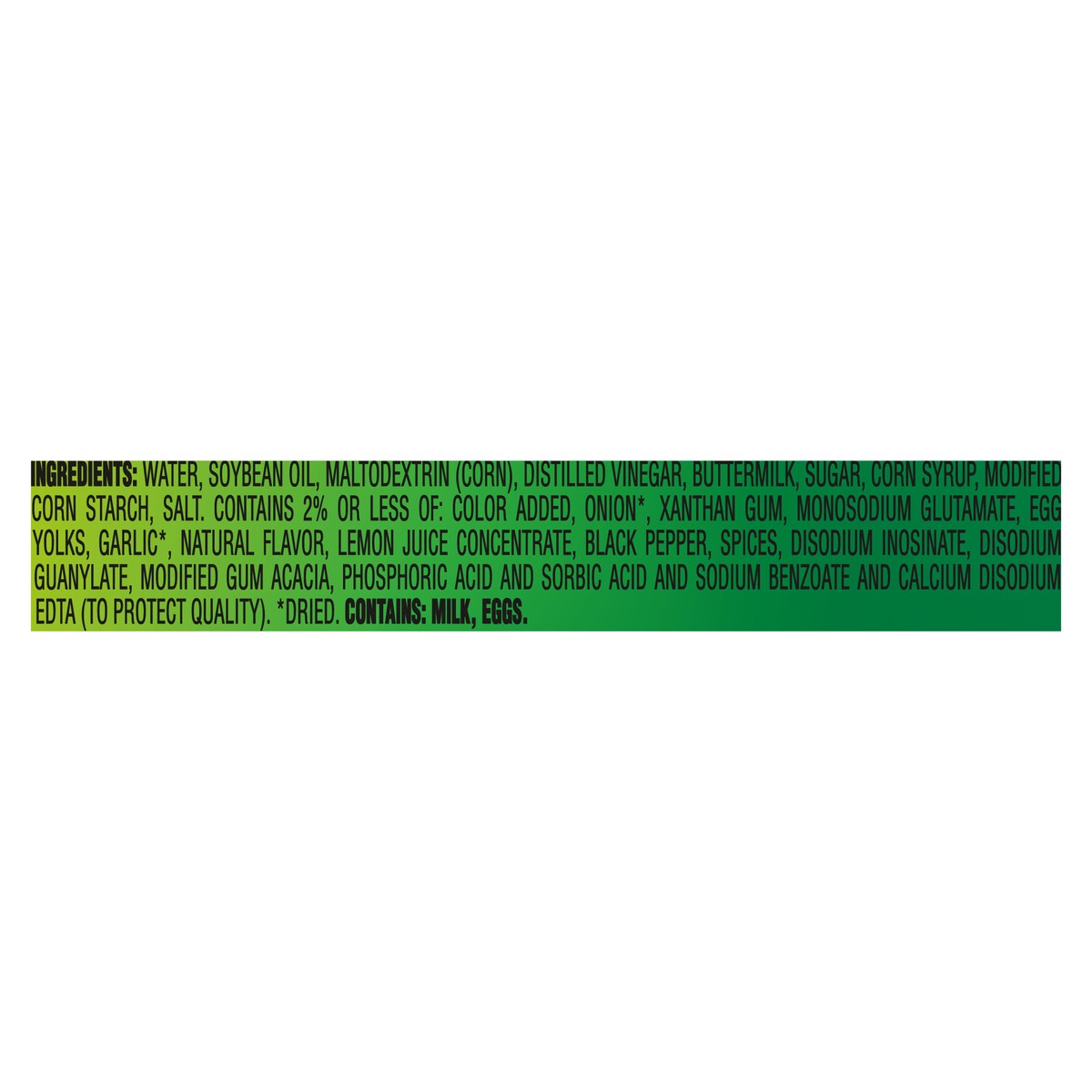 Water, Soybean Oil, Maltodextrin (Corn), Distilled Vinegar, Buttermilk, Sugar, Corn Syrup, Modified Corn Starch, Salt, Contains 2% or Less of: Color Added, Onion*, Xanthan Gum, Monosodium Glutamate, E…