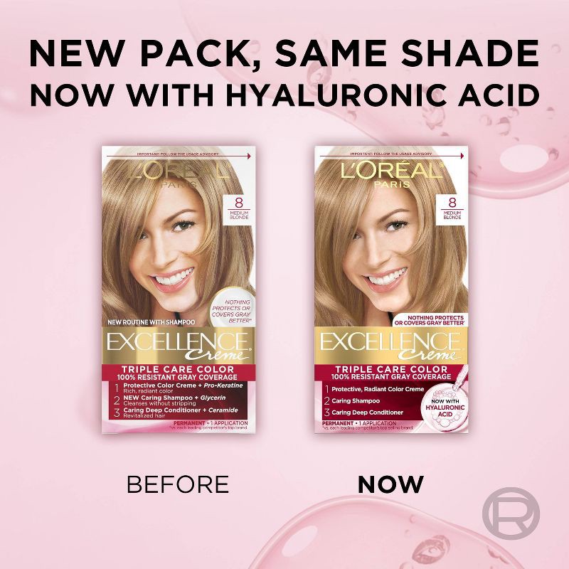 - Your Excellence Just Got Better: New Triple Care Color Routine infused with Hyaluronic Acid protects hair before, during, and after coloring for up to 8 weeks with a combination of ceramide, pro-keratine, and glycerin for rich color and revitalized hair. New look same great shades