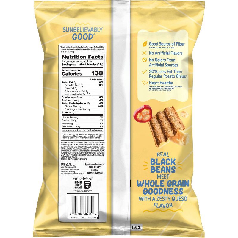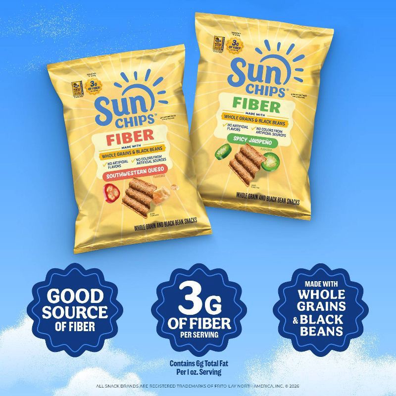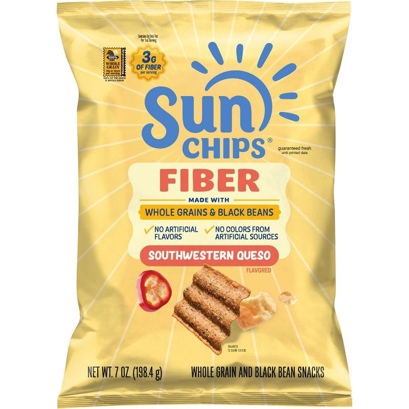 - Southwestern Queso SunChips Fiber Whole Grain and Black Bean Snacks: Real black beans meet whole grain goodness with a zesty queso flavor.