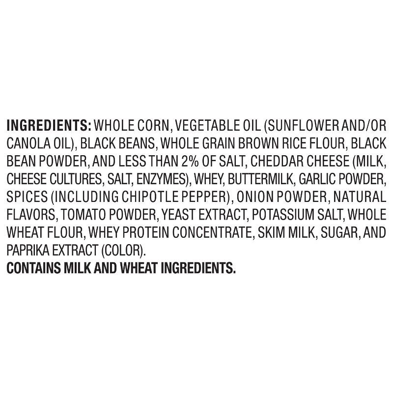 Whole Corn, Vegetable Oil (Sunflower And/Or Canola Oil), Black Beans, Whole Grain Brown Rice Flour, Black Bean Powder, And Less Than 2% Of Salt, Cheddar Cheese (Milk, Cheese Cultures, Salt, Enzymes), …