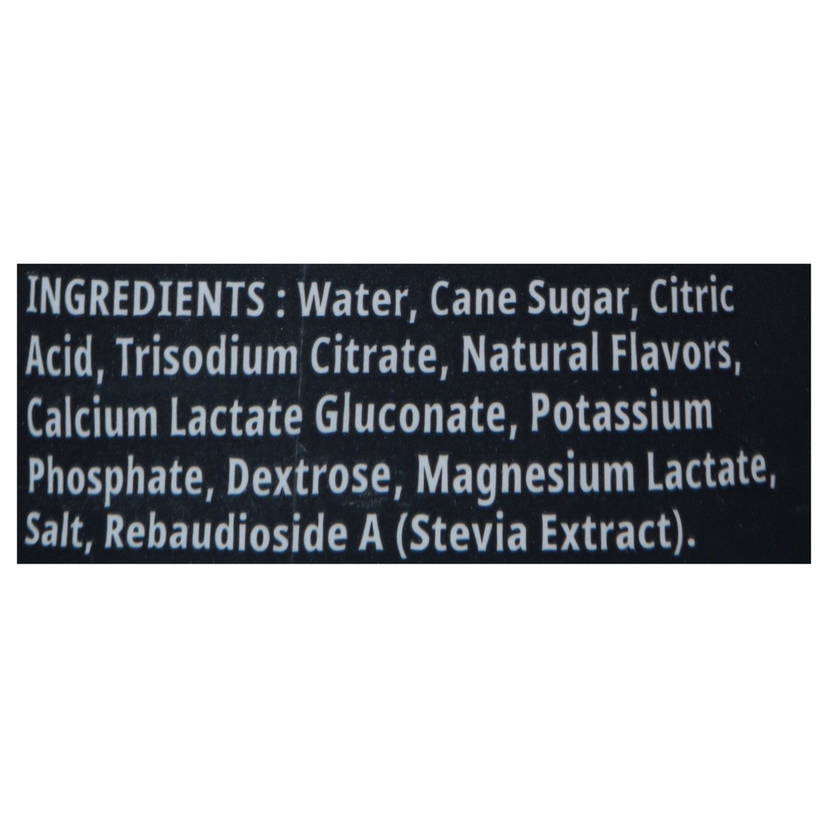 Water, Cane Sugar, Citric Acid, Trisodium Citrate, Natural Flavors, Calcium Lactate Gluconate, Potassium Phosphate, Dextrose, Magnesium Lactate, Salt, Rebaudioside A (Stevia Extract).
