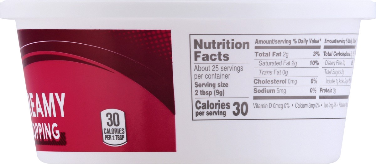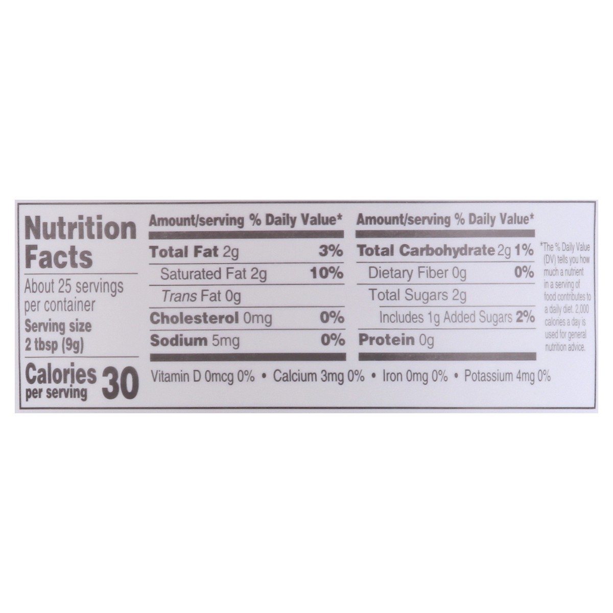 30 calories per 2 tbsp. 100% satisfaction guarantee. Our quality commitment. If not 100% satisfied, return unused product to your store for a prompt and cheerful refund.