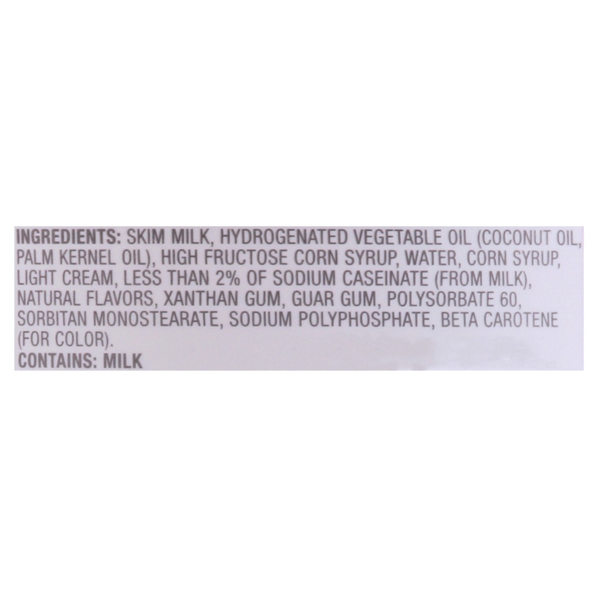 Skim Milk, Hydrogenated Vegetable Oil (Coconut Oil, Palm Kernel Oil), High Fructose Corn Syrup, Water, Corn Syrup, Light Cream, Less than 2% of Sodium Caseinate (from Milk), Natural Flavors, Xanthan G…