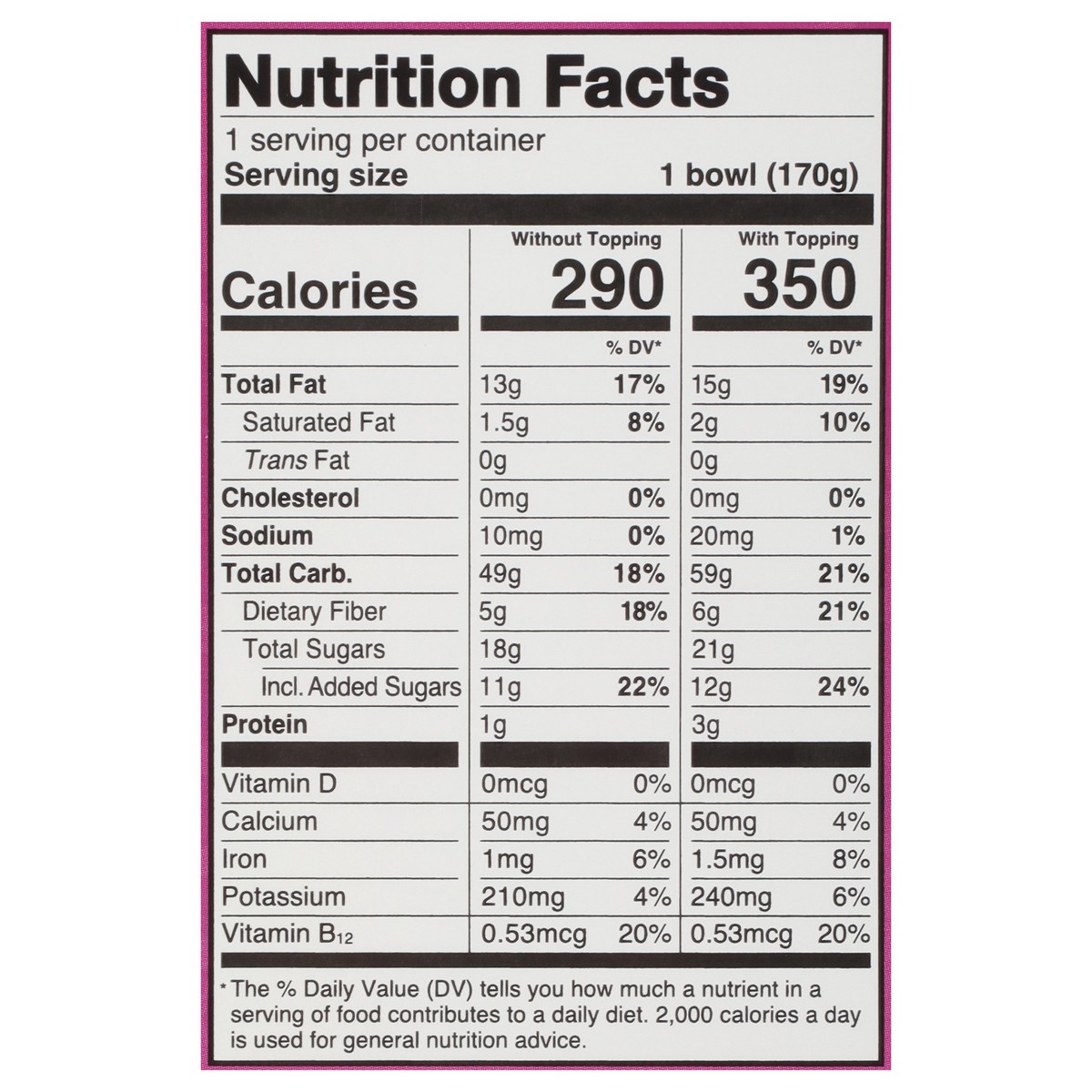 Smoothie Base: Acai Puree* (Purified Water, Acai*), Water, Tapioca Syrup*, Banana Puree*, Blueberry Juice Concentrate*, Sunflower Oil*, Cane Sugar*, Allulose*, Tapioca Fiber*, Strawberry Juice Concent…
