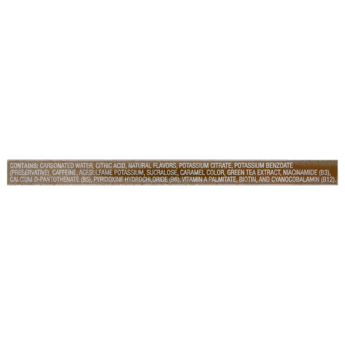 Contains: Carbonated Water, Citric Acid, Natural Flavors, Potassium Citrate, Potassium Benzoate (Preservative), Caffeine, Acesulfame Potassium, Sucralose, Caramel Color, Green Tea Extract, Niacinamide…