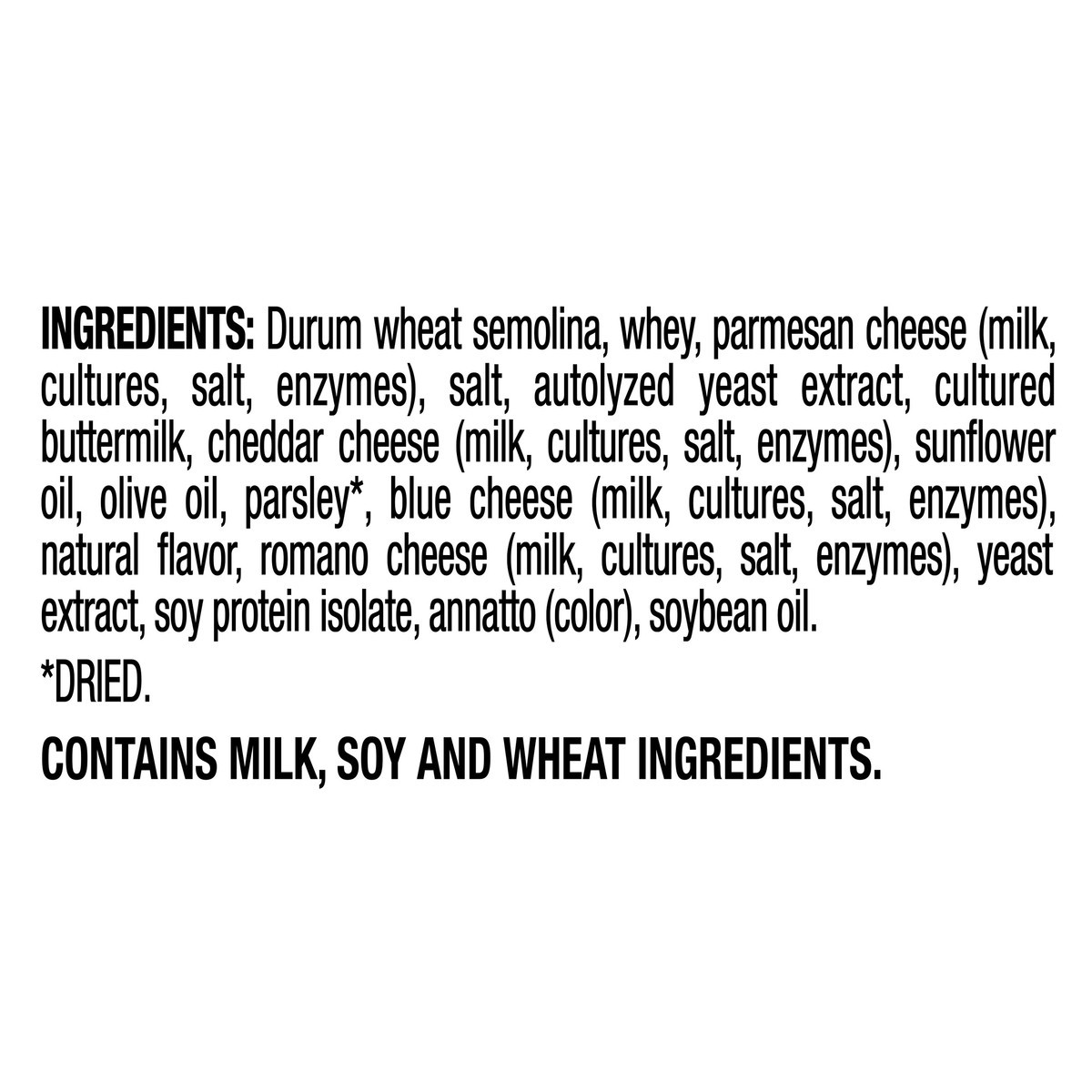 DURUM WHEAT SEMOLINA, WHEY, PARMESAN CHEESE (MILK, CULTURES, SALT, ENZYMES), SALT, AUTOLYZED YEAST EXTRACT, CULTURED BUTTERMILK, CHEDDAR CHEESE (MILK, CULTURES, SALT, ENZYMES), SUNFLOWER OIL, OLIVE OI…