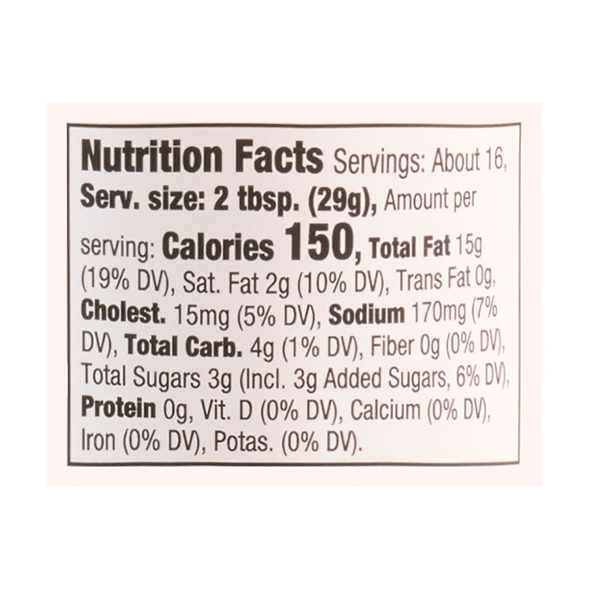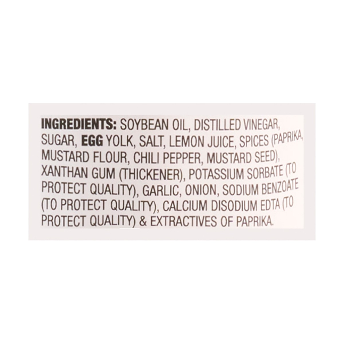Soybean Oil, Distilled Vinegar, Sugar, Egg Yolk, Salt, Lemon Juice, Spices (Paprika, Mustard Flour, Chili Pepper, Mustard Seed), Xanthan Gum (Thickener), Potassium Sorbate (to Protect Quality), Garlic…