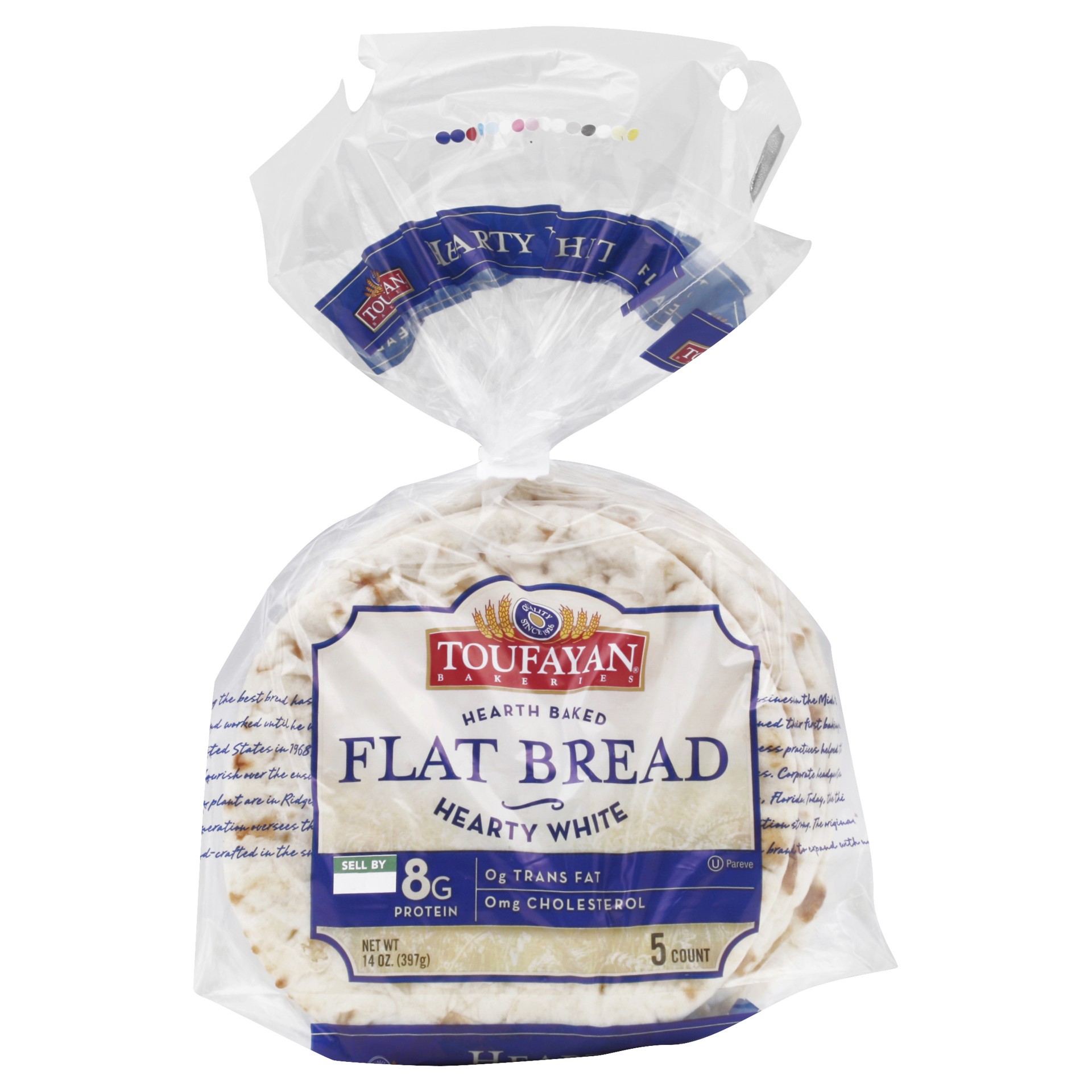 Quality since 1926. 8 g protein. 0 g trans fat. 0 mg cholesterol. Since 1926, families have been relyin' on the fresh taste of Toufayan. Families have trusted Toufayan to bring them the best tasting, …