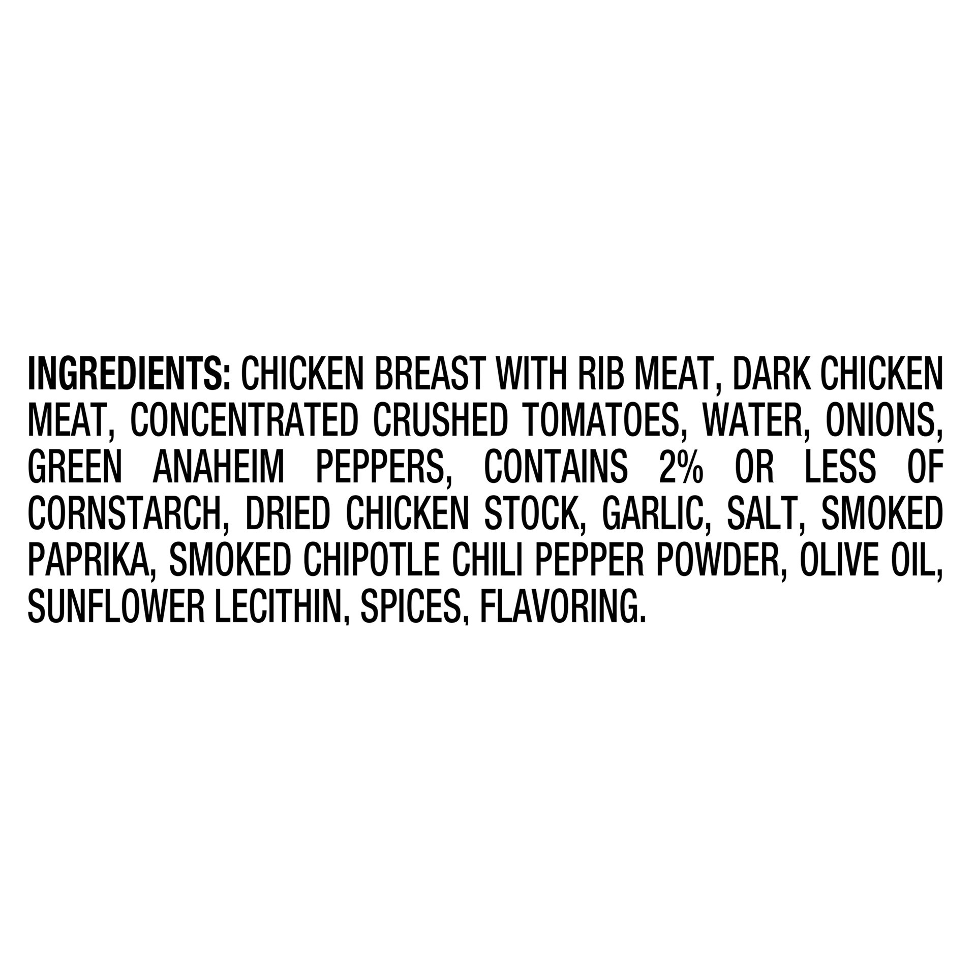 Chicken Breast with Rib Meat, Dark Chicken Meat, Concentrated Crushed Tomatoes, Water, Onions, Green Anaheim Peppers, Contains 2% or Less of Cornstarch, Dried Chicken Stock, Garlic, Salt, Smoked Papri…