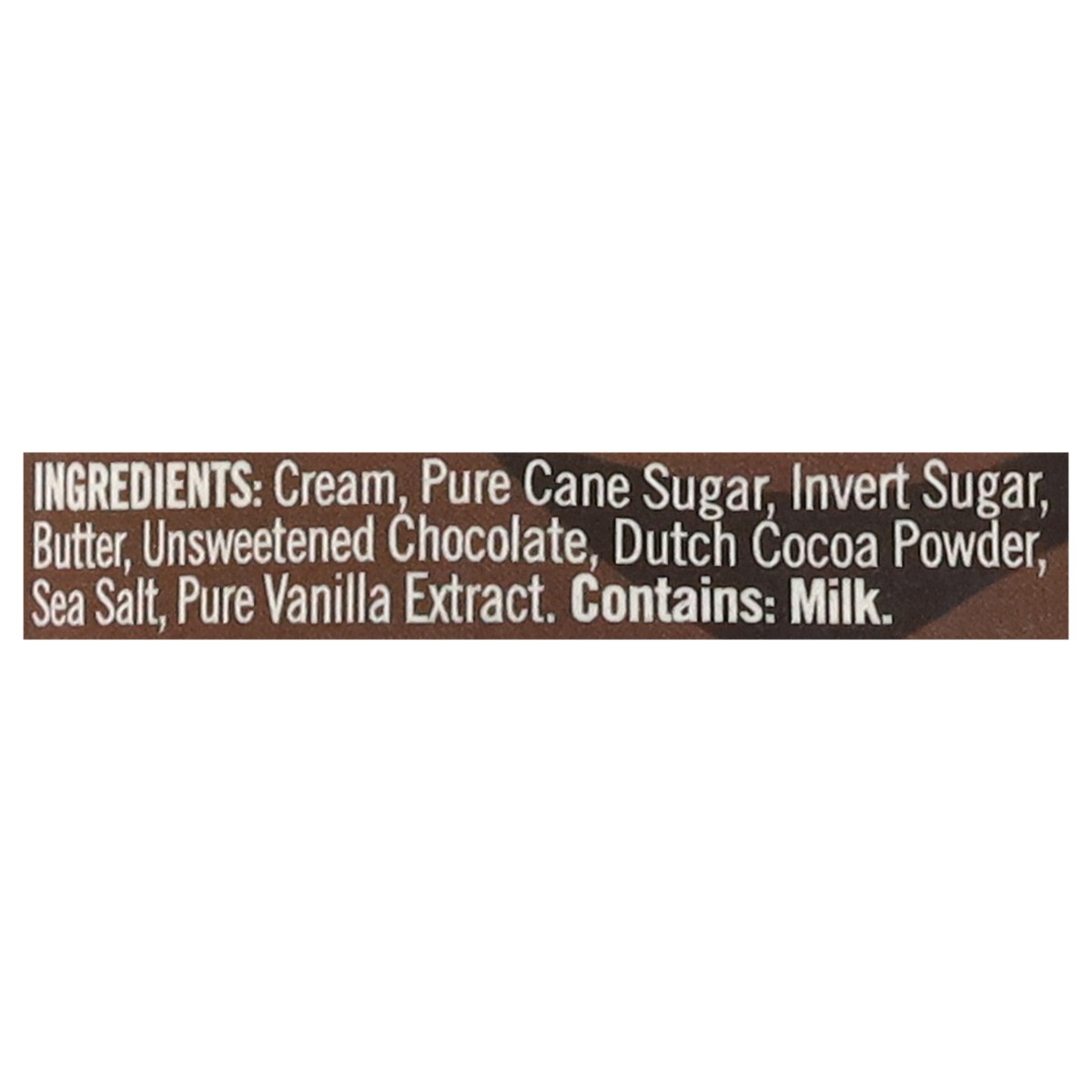 Cream, Pure Cane Sugar, Invert Sugar, Butter, Unsweetened Chocolate, Dutch Cocoa Powder, Sea Salt, Pure Vanilla Extract.