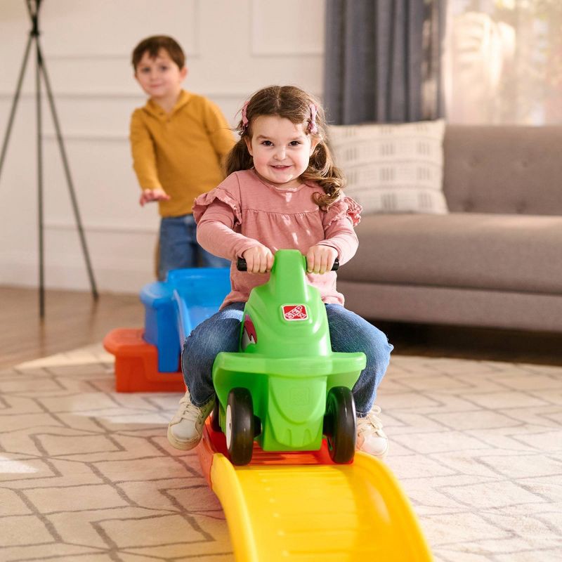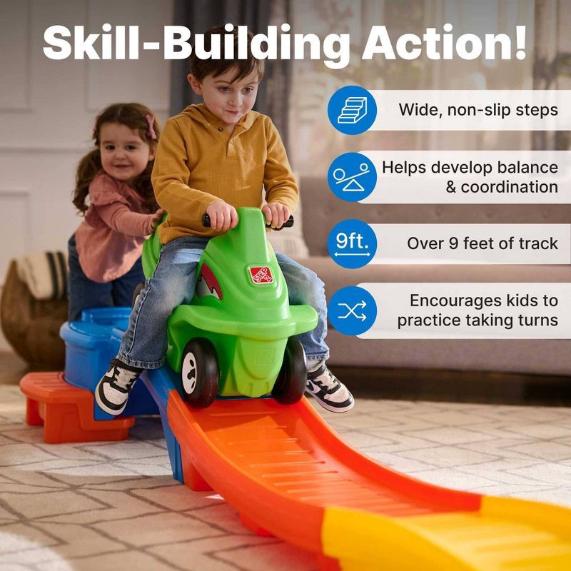 - KID-POWERED FUN: Toddlers can climb the wide, kid-friendly steps and board the ride-on car on their own; They can safely work on practicing gross motor skills, balance, and hand-eye coordination as they push the coaster car back up and ride again.