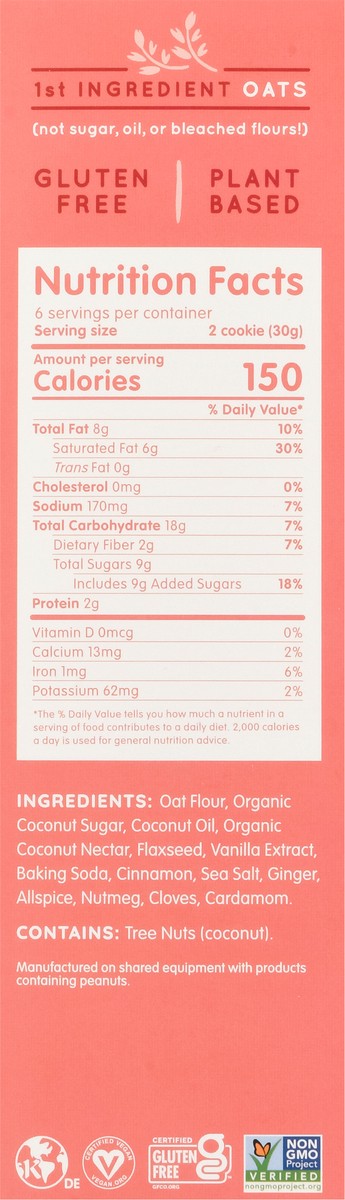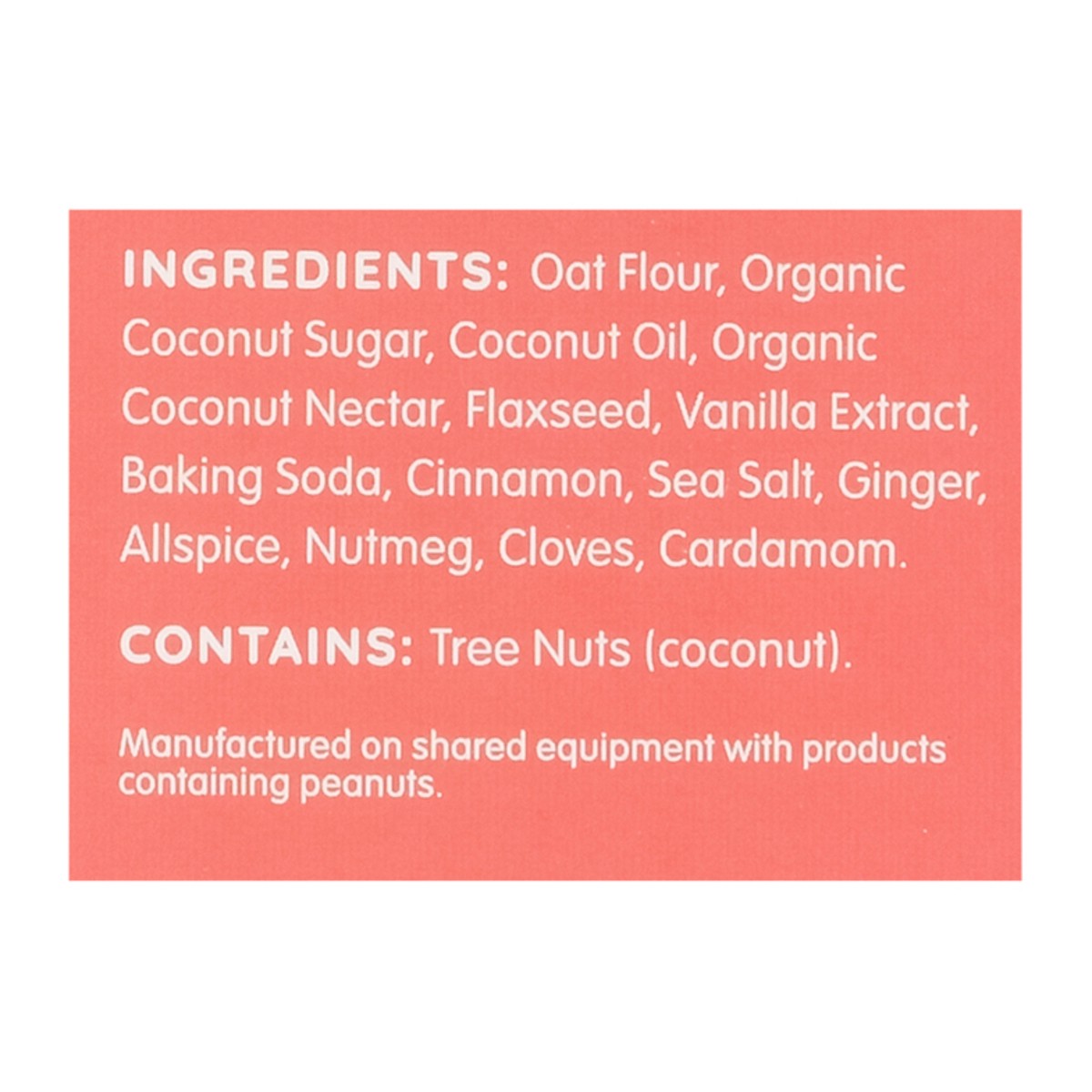 Oat Flour, Organic Coconut Sugar, Coconut Oil, Organic Coconut Nectar, Flaxseed, Vanilla Extract, Baking Soda, Cinnamon, Sea Salt, Ginger, Allspice, Nutmeg, Cloves, Cardamom.