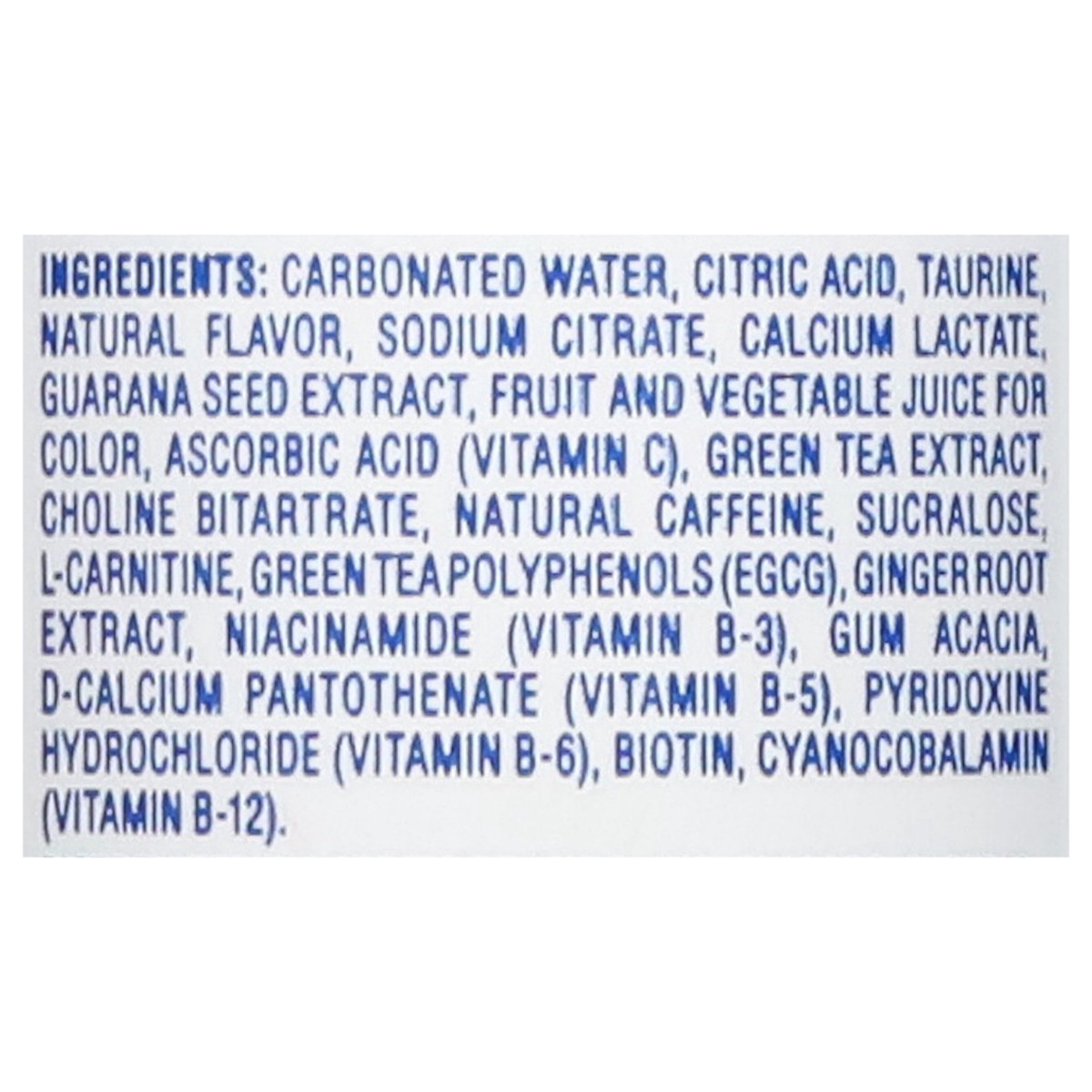 Carbonated Water, Citric Acid, Taurine, Natural Flavor, Sodium Citrate, Calcium Lactate, Guarana Seed Extract, Fruit and Vegetable Juice for Color, Ascorbic Acid (Vitamin C), Green Tea Extract, Cholin…