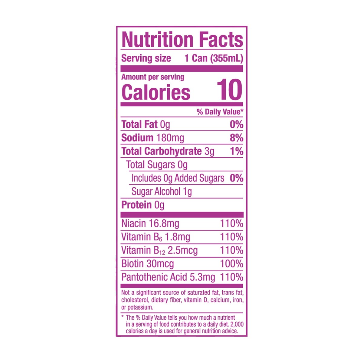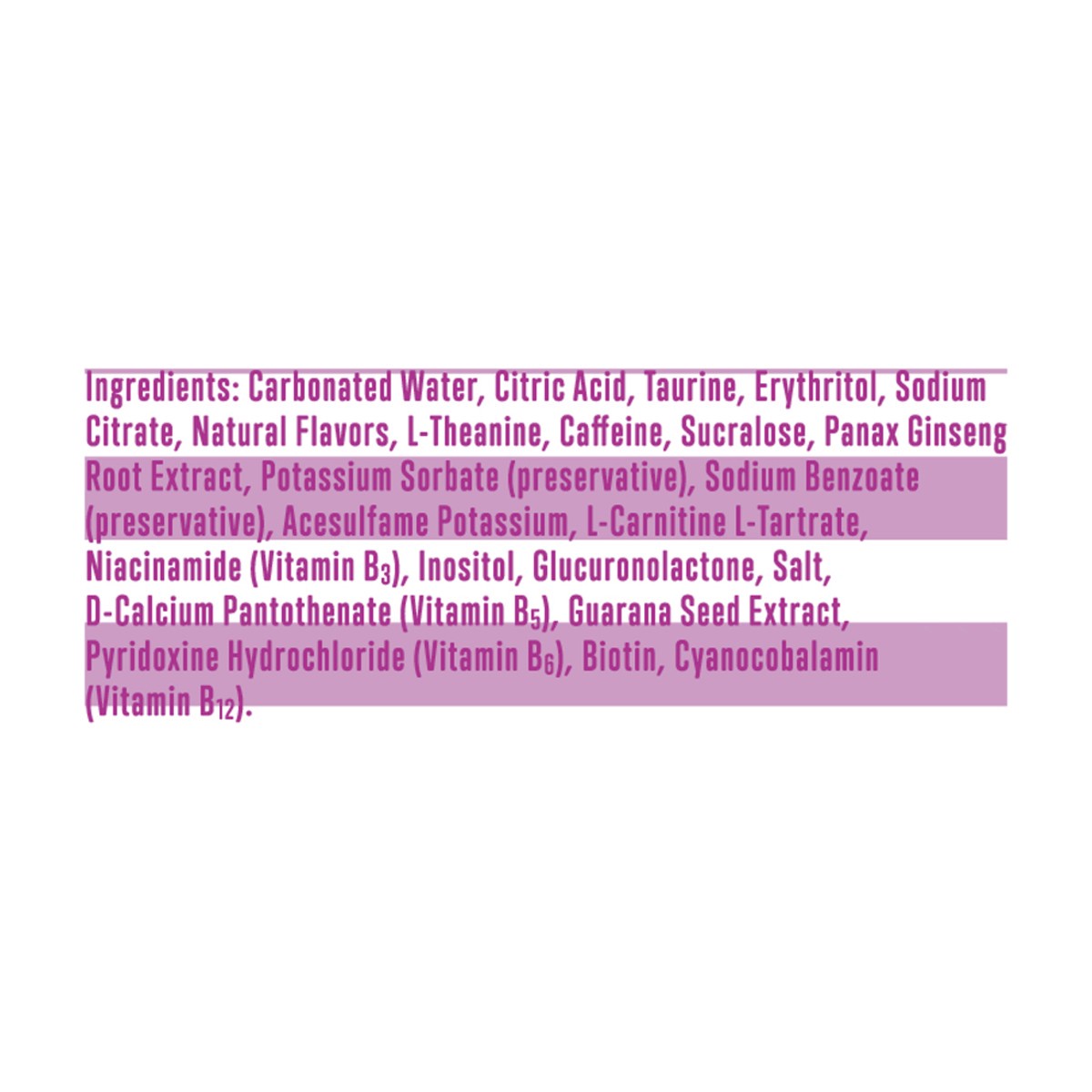 Carbonated Water, Citric Acid, Taurine, Erythritol, Sodium Citrate, Natural Flavors, L-Theanine, Caffeine, Sucralose, Panax Ginseng Root Extract, Potassium Sorbate (Preservative), Sodium Benzoate (Pre…