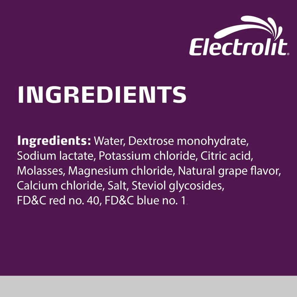 Water, Dextrose Monohydrate, Sodium Lactate, Potassium Chloride, Citric Acid, Molasses, Magnesium Chloride, Natural Grape Flavor, Calcium Chloride, Salt, Steviol Glycosides, FD&C Red 40, FD&C Blue 1.