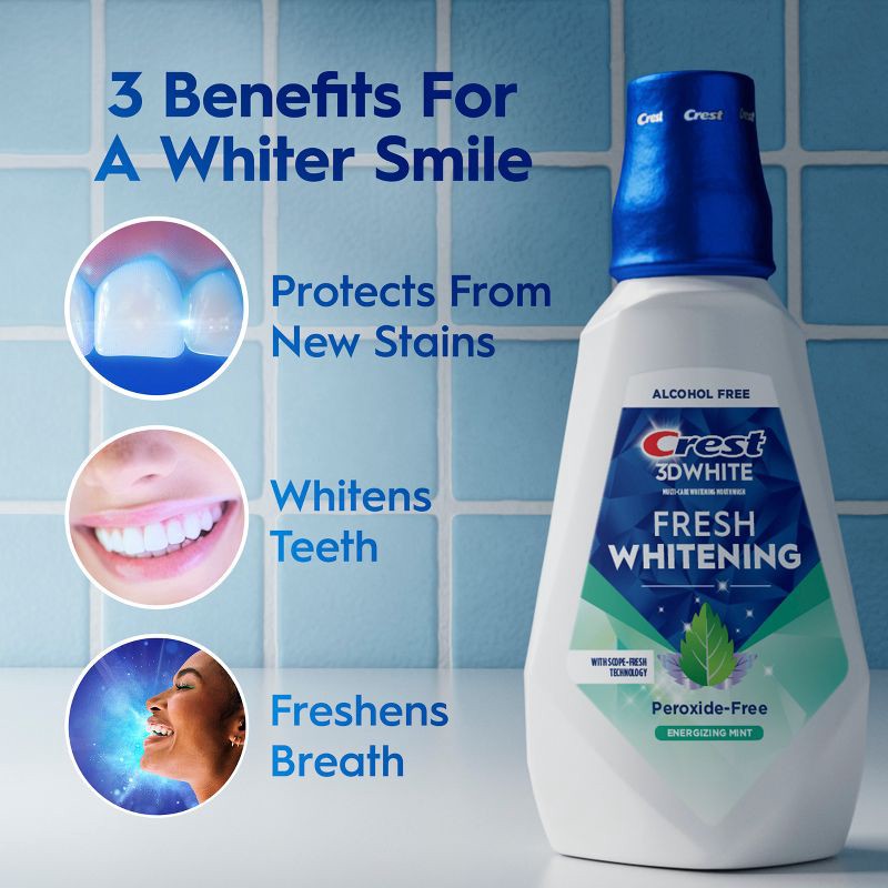 Rinse your way to a more vibrant, brilliant smile with Crest 3D White Fresh Whitening Mouthwash. This gentle yet effective whitening rinse features a foaming action to safely lift surface stains so yo…