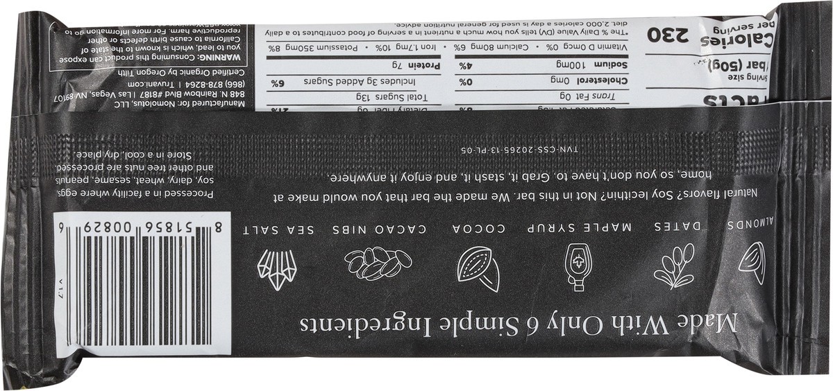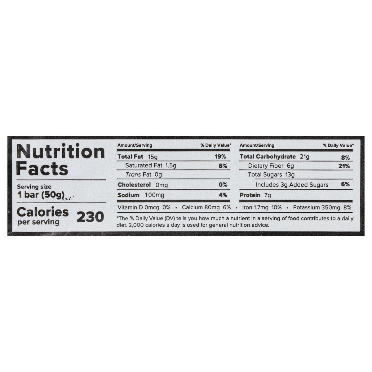 Organic Almonds, Organic Dates, Organic Maple Syrup, Organic Cocoa, Organic Cacao Nibs, Sea Salt.