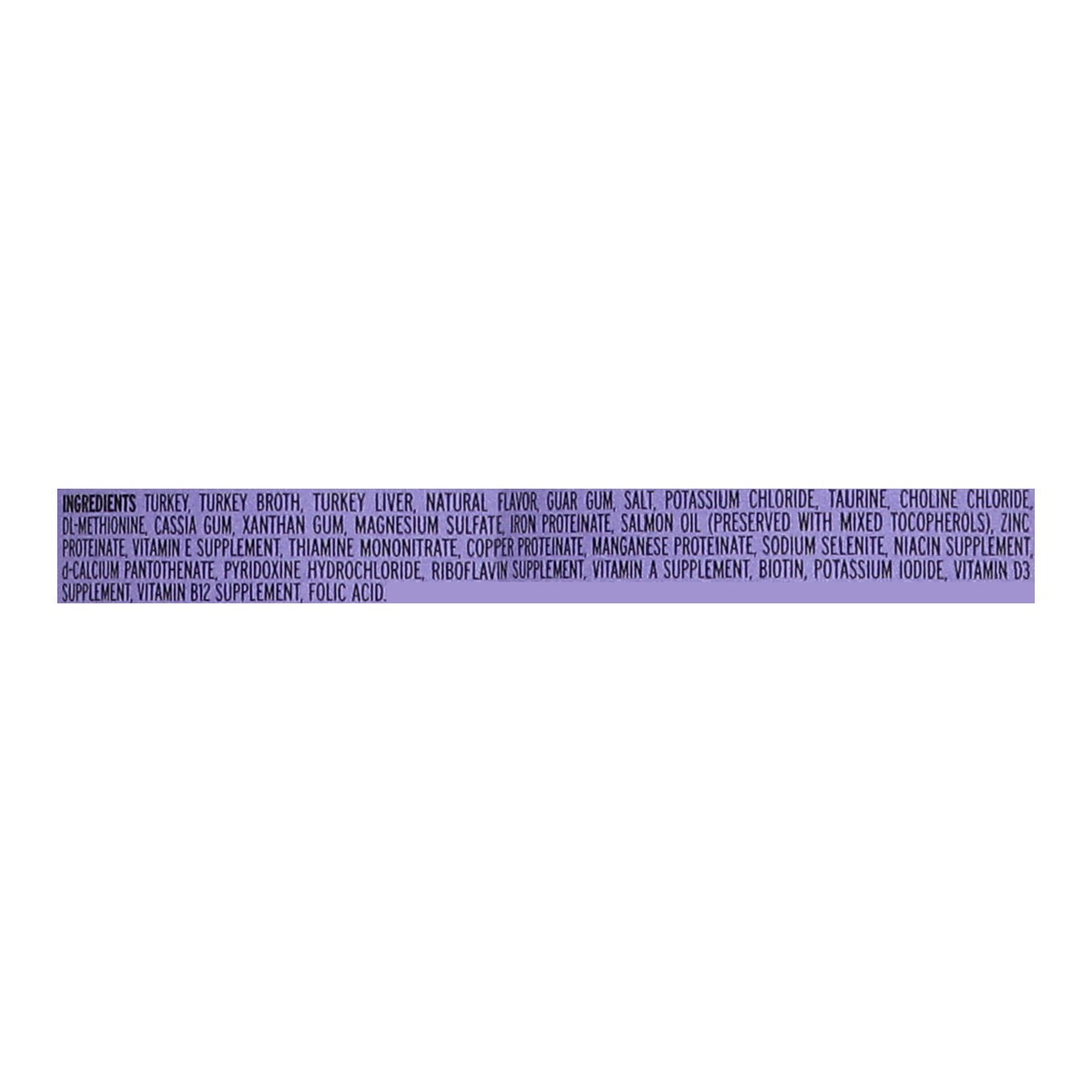 Turkey, Turkey Broth, Turkey Liver, Natural Flavor, Guar Gum, Salt, Potassium, Chloride, Taurine, Choline Chloride, DL-Methionine, Cassia Gum, Xanthan Gum, Magnesium Sulfate, Iron Proteinate, Salmon O…