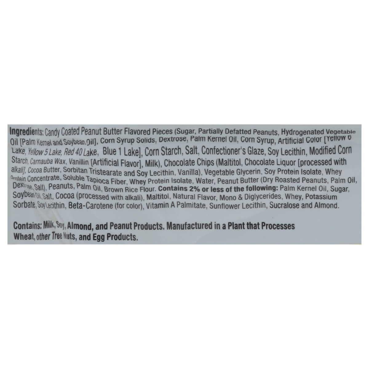 Candy Coated Peanut Butter Flavored Pieces (Sugar, Partially Defatted Peanuts, Hydrogenated Vegetable Oil [Palm Kernel and Soybean Oil], Corn Syrup Solids, Dextrose, Palm Kernel Oil, Corn Syrup, Artif…