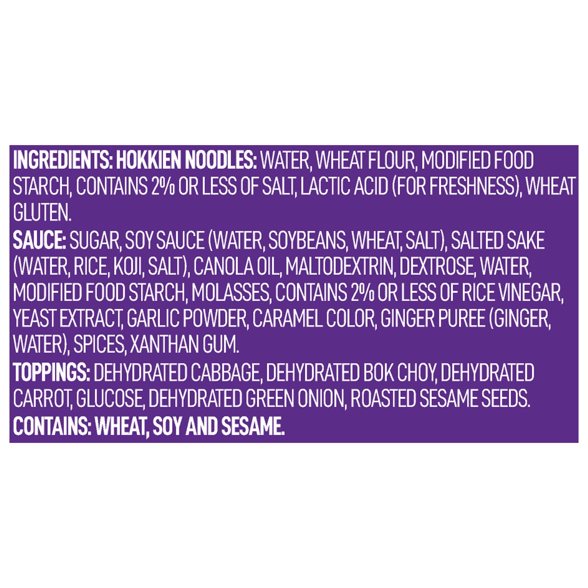 INGREDIENTS: HOKKIEN NOODLES: WATER, WHEAT FLOUR, MODIFIED FOOD STARCH, CONTAINS 2% OR LESS OF SALT, LACTIC ACID (FOR FRESHNESS), WHEAT GLUTEN. SAUCE: SUGAR, SOY SAUCE (WATER, SOYBEANS, WHEAT, SALT), …