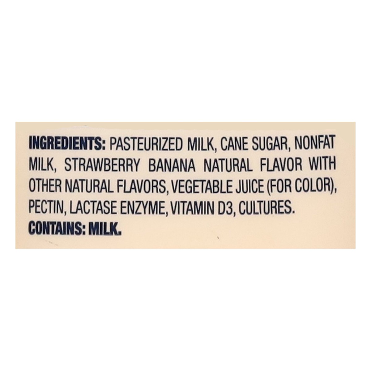 Pasteurized Milk, Cane Sugar, Nonfat Milk, Strawberry Banana Natural Flavor with Other Natural Flavors, Vegetable Juice (for Color), Pectin, Lactase Enzyme, Vitamin D3, Cultures.