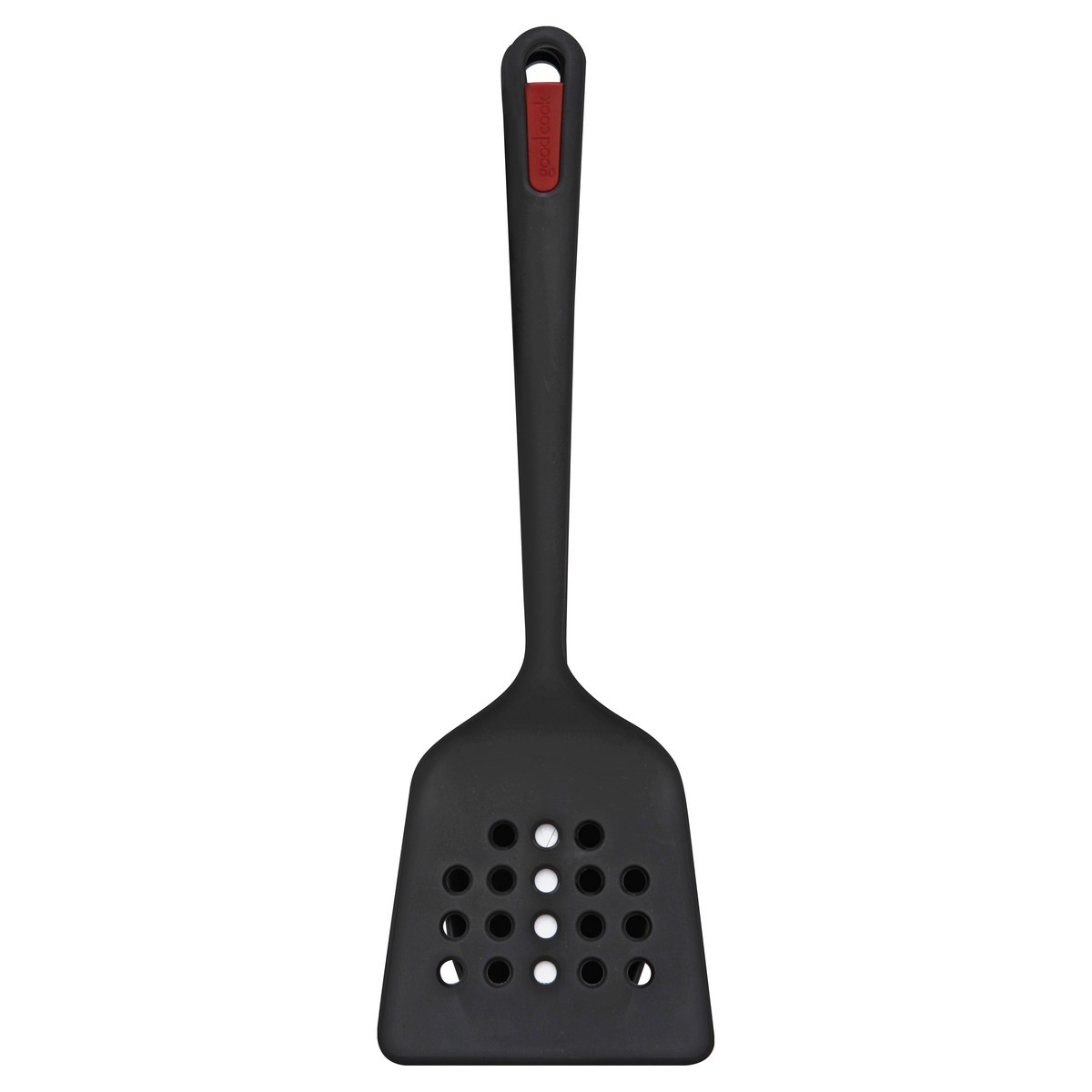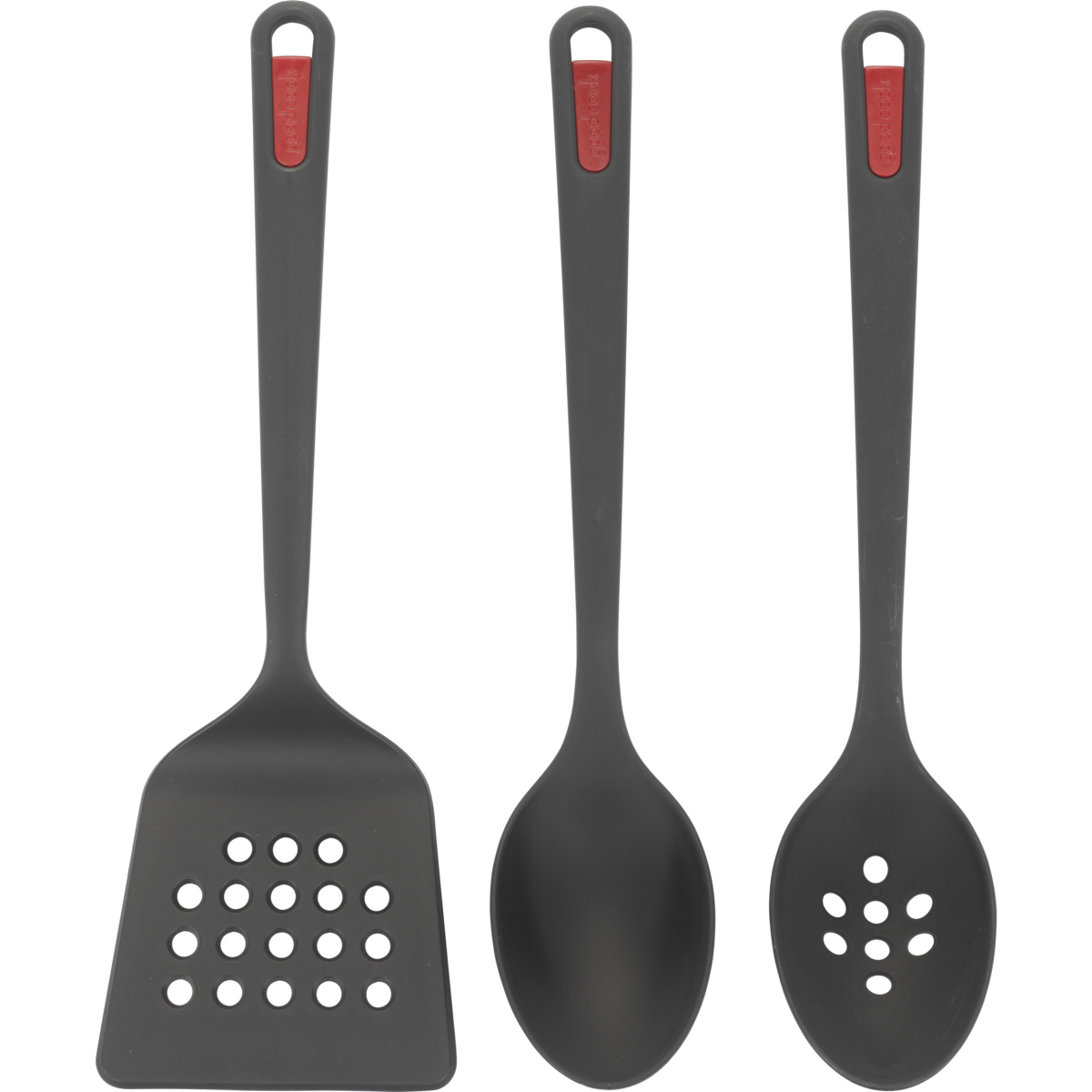 Dishwasher safe. 100% satisfaction guarantee. www.goodcook.com. Nylon slotted spoon (Made in Taiwan). Nylon basting spoon (Made in Taiwan). Large nylon turner (Made in Taiwan). Made in China.