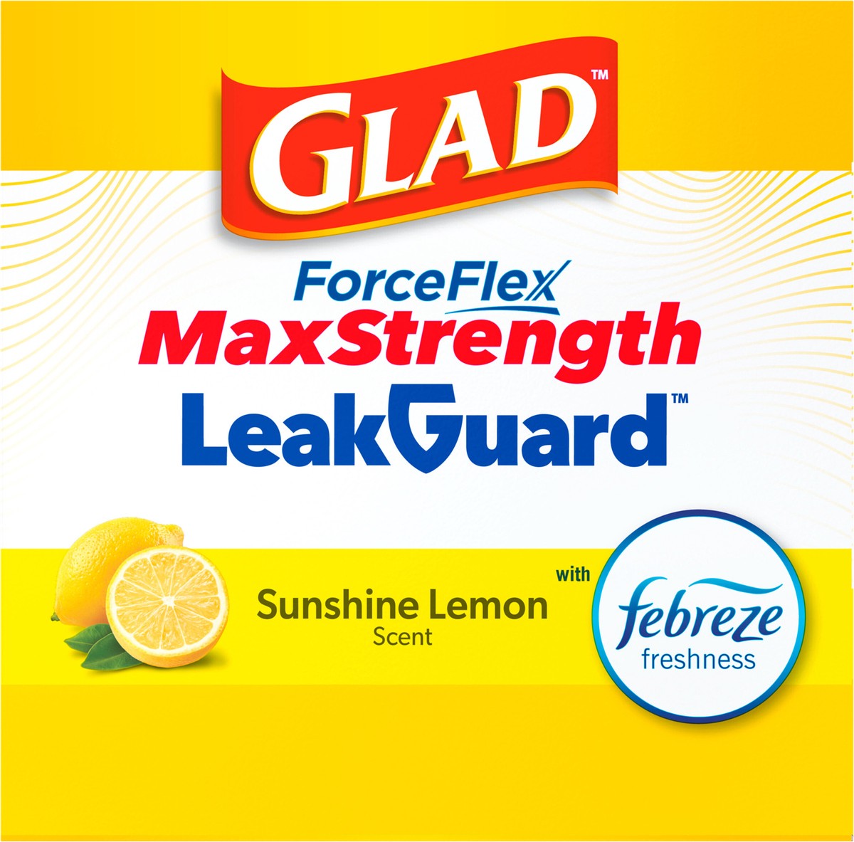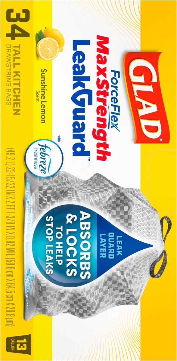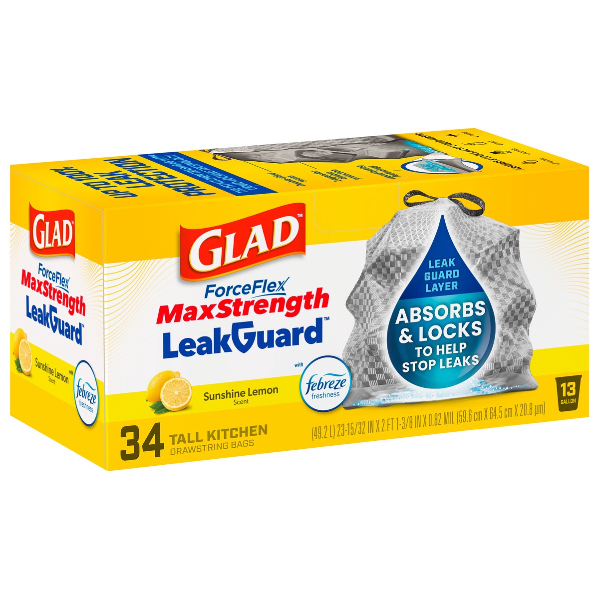 Glad ForceFlex MaxStrength LeakGuard Tall Kitchen Drawstring Trash Bags, 13 Gallon, Sunshine Lemon Scent with Febreze Freshness, 34 Count
