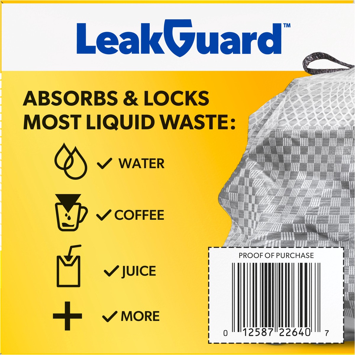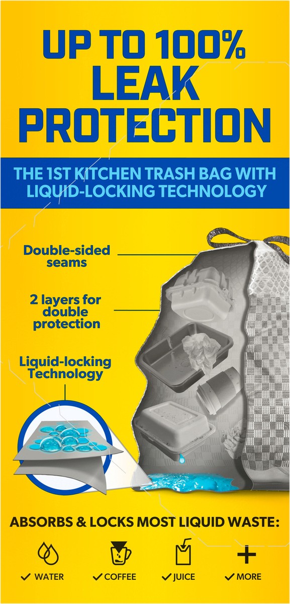 - LEAKGUARD TRASH BAG: Tackle kitchen chores with confidence thanks to the first kitchen trash bag with liquid locking technology that absorbs liquids for up to 100% leak protection; pack may vary