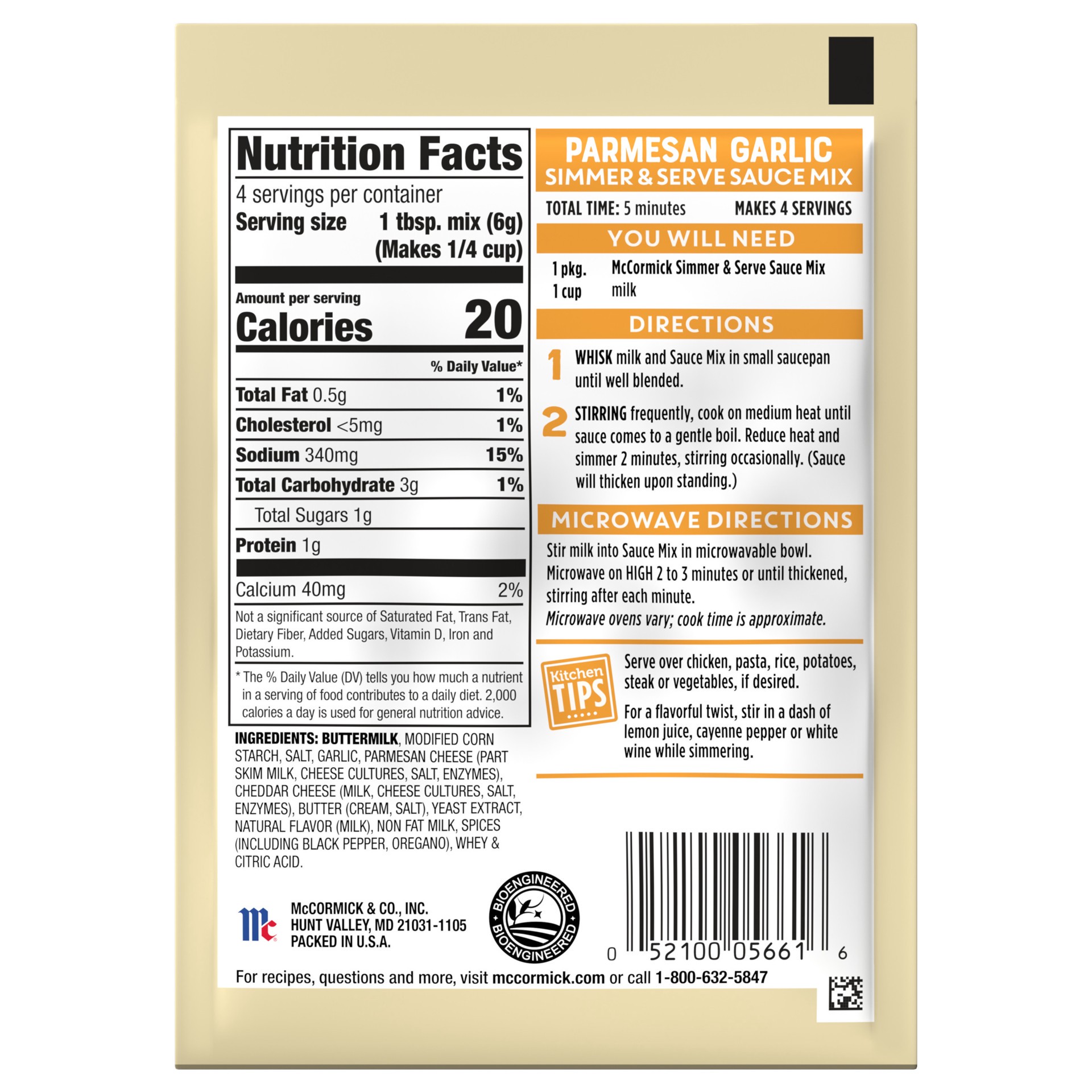 McCormick Parmesan Garlic Sauce Mix helps you break out of your dinner rut with a sauce so versatile that it goes great over chicken, steak, pasta, rice, potatoes and veggies. This 5-minute sauce deli…
