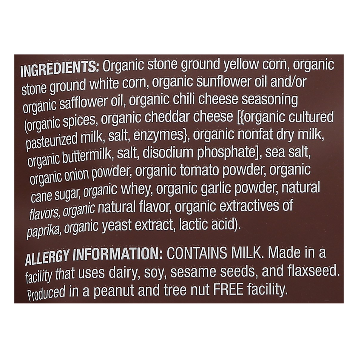 Organic Stone Ground Yellow Corn, Organic Stone Ground White Corn, Organic Sunflower Oil and/or Organic Safflower Oil, Organic Chili Cheese Seasoning (Organic Spices, Organic Cheddar Cheese [{Organic …