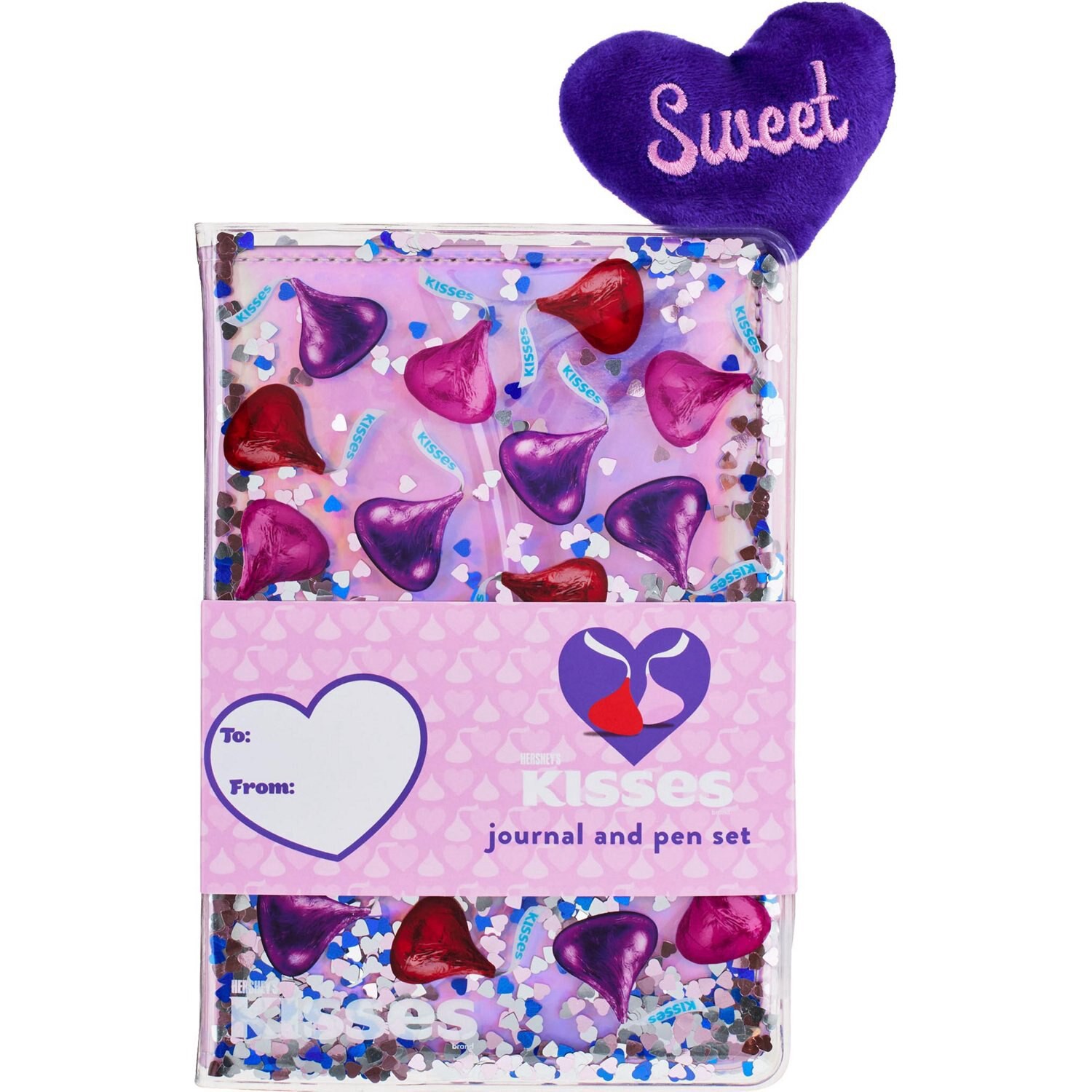 Hershey Valentine's Day sweet kisses journal and pen set. Allover Hershey Kisses print journal with special cover effect Notebook has iridescent cover with confetti inside Heart shape plush topper pen…