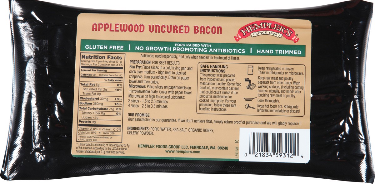 Applewood smoked. Family owned since 1934. US inspected and passed by Department of Agriculture. 80 years. 1934-2014. No nitrite or nitrate added except for those naturally occurring in sea salt and c…