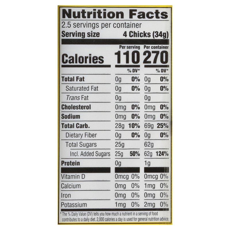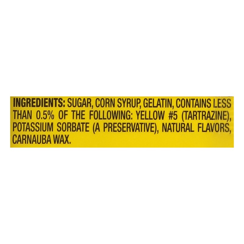 Sugar, Corn Syrup, Gelatin, Contains Less than 0.5% of the Following: Yellow 5 (Tartrazine), Potassium Sorbate (a Preservative), Natural Flavors, Carnauba Wax.