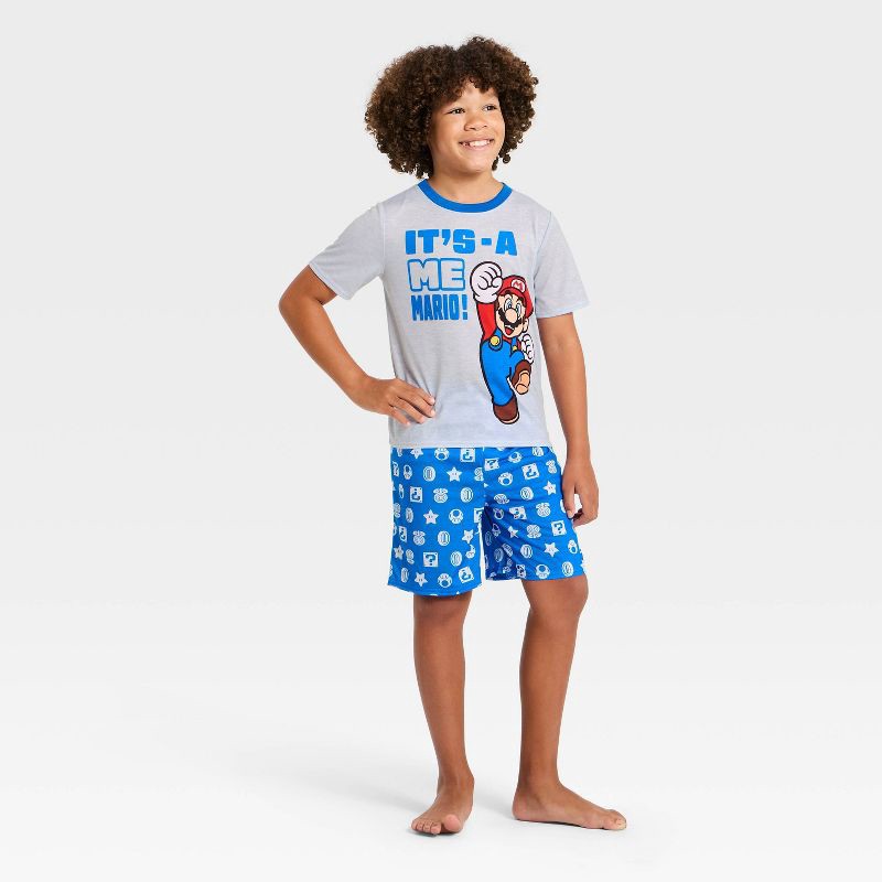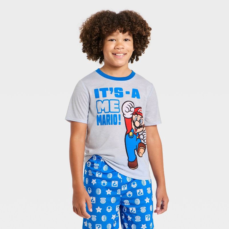 It's a Me Mario! These pajamas feature Mario along with various game icons. This 2-piece set includes a short sleeve t-shirt with contrast trim and shorts with an elastic waistband for an all-around c…
