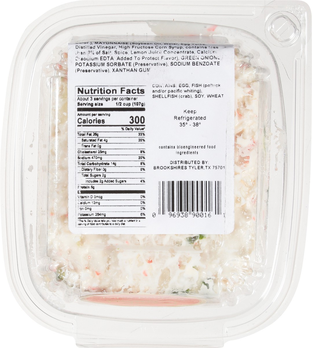 Contains: egg, fish (pollock and/or pacific whiting), shellfish (crab), soy, wheat.