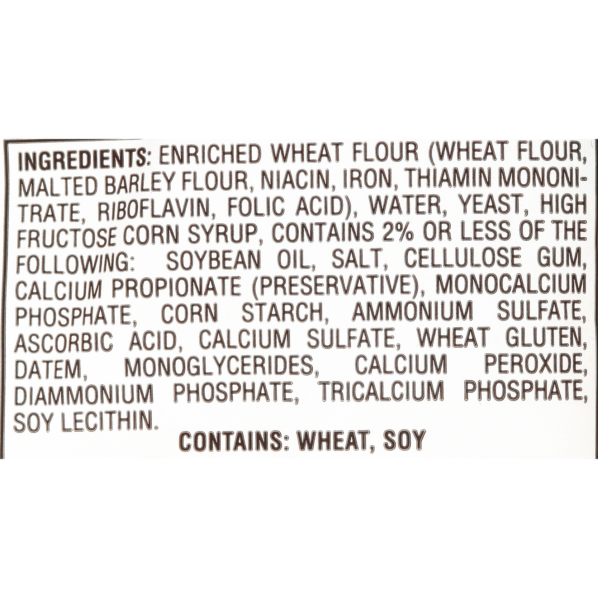 Ingredients: Enriched Wheat Flour (Wheat Flour, Malted Barley Flour, Niacin, Iron, Thiamin Mononitrate, Riboflavin, Folic Acid), Water, Yeast, High Fructose Corn Syrup, Contains 2% Or Less Of The Foll…