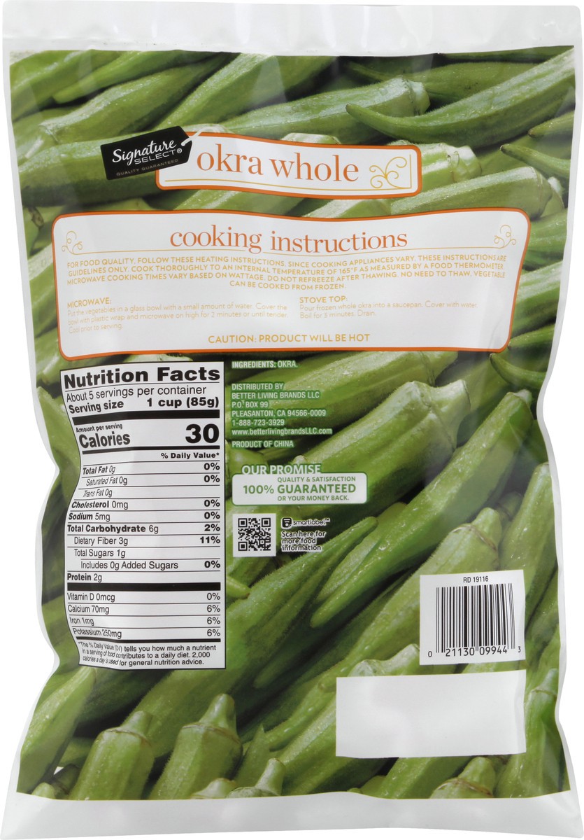 Per 1 Cup: 30 calories; 0 g sat fat (0% DV); 5 mg sodium (0% DV); 1 g total sugars. Fresh frozen. Delicious and sweet. Flavorful. Our selection of quality fresh-frozen whole okra. Quality guaranteed. …
