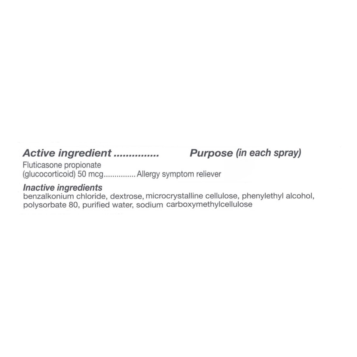 Active Ingredients: (In each spray) Fluticasone propionate (glucocorticoid) 50 mcg - Allergy symptom reliever; Inactive Ingredients: benzalkonium chloride, dextrose, microcrystalline cellulose, phenyl…
