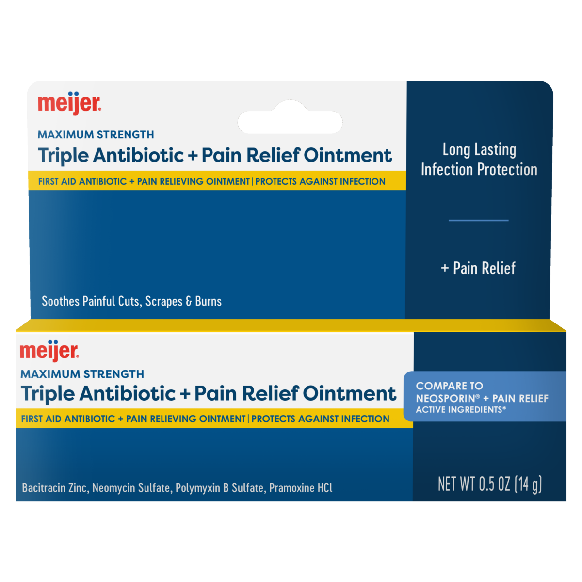 Fight against infections and soothe mild pain with Meijer Maximum Strength Triple Antibiotic Pain Relief Ointment. This convenient firstaid product provides temporary relief and protects against infe…