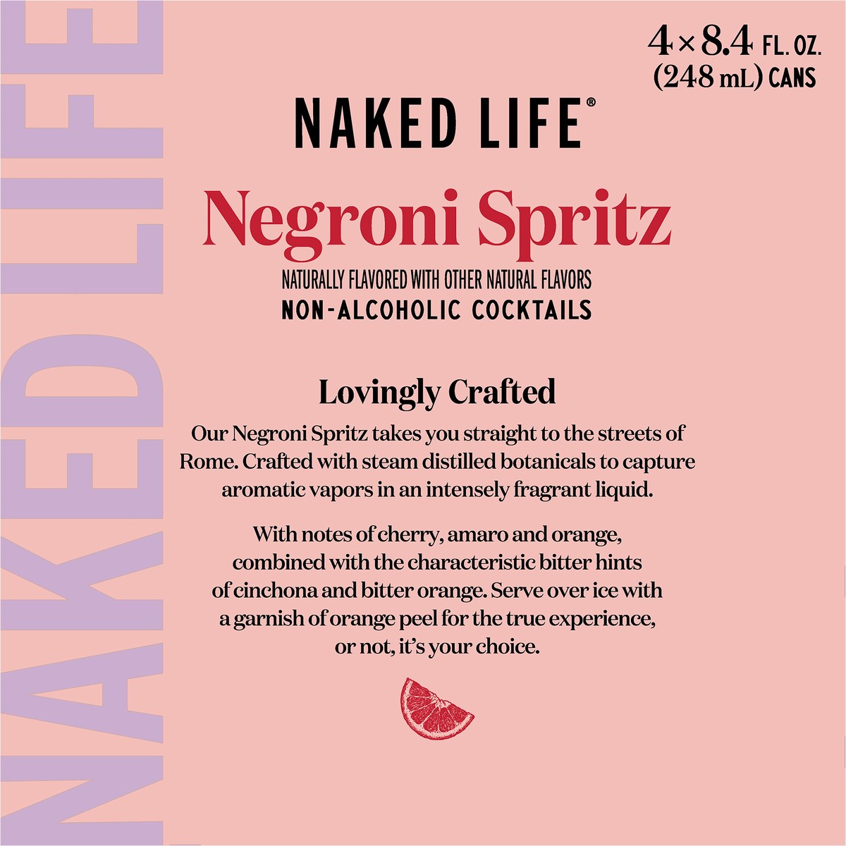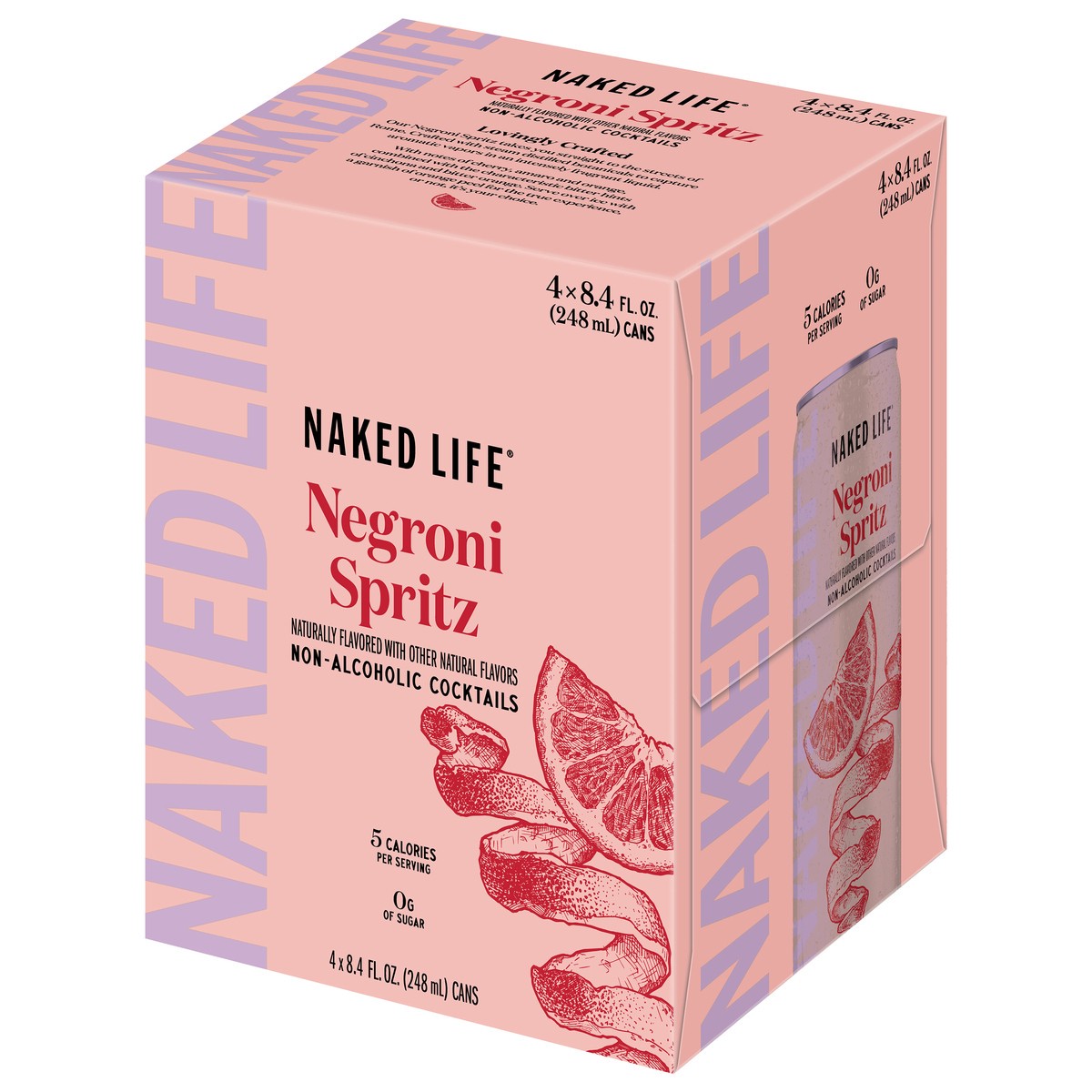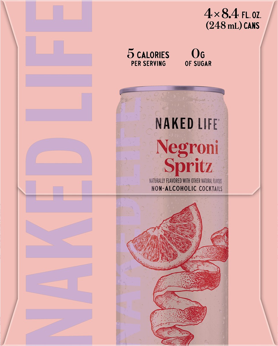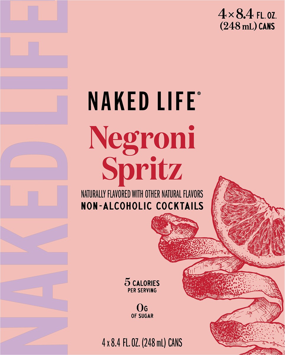 - 4 pack 8.4 fl oz cans of Naked Life Negroni Spritz Non-Alcoholic CocktailNon-alcoholic Negroni Spritz combines notes of cherry, amaro and orange with the characteristic bitter hints of cinchona and bitter orangeZero grams of sugar and 5 caloriesReady to drink straight from the can, or serve over ice with a garnish of orange peelToast to the moment on your own terms with Naked Life non-alcoholic cocktails –– try all our flavors